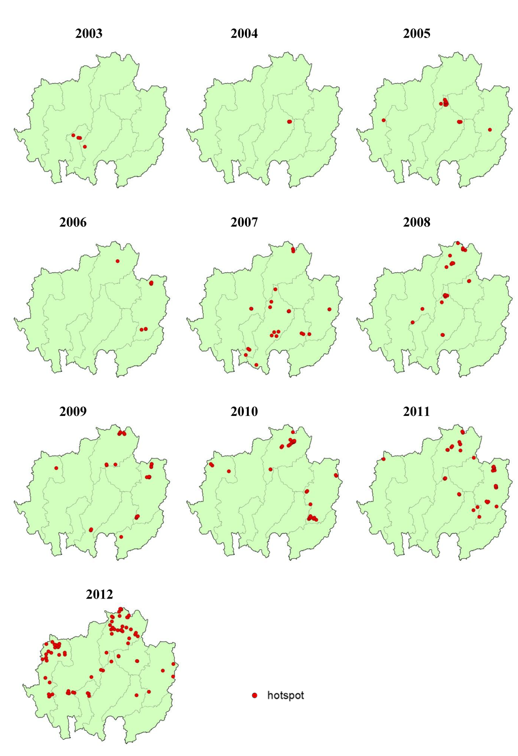 Figure 10 shows the changes in the number of affected villages, the number of cases and the number of hotspots from 2003 to 2012. The number of affected villages followed a similar trend to that of the number of cases over nearly the entire period. In contrast, the trend in the number of hotspots differed, especially in the period from 2007 to 2012. After 2007, the number of affected villages and HFMD cases decreased, whereas the number of hotspots increased continuously until 2012.