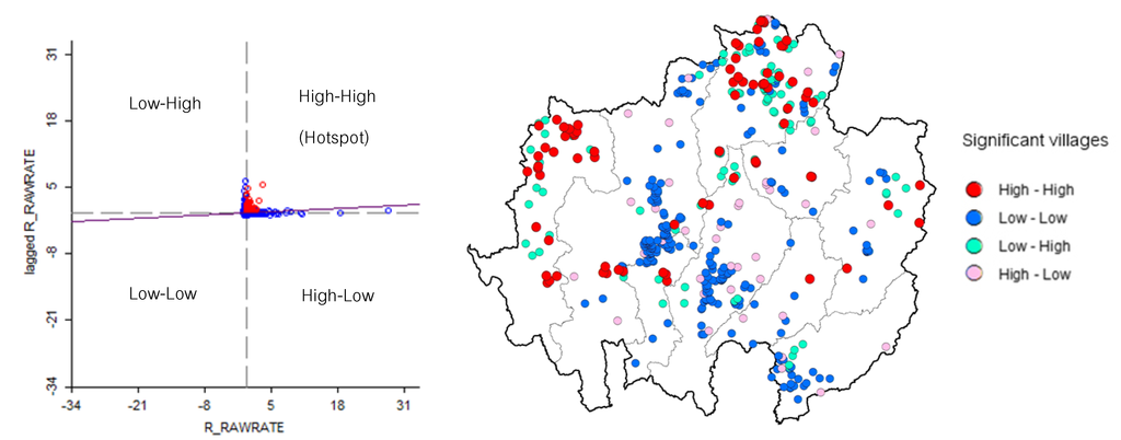 Moran’s I has well-established statistical properties to describe global spatial autocorrelations. However, it is not effective in identifying clustered spatial patterns. These clusters are also described as hotspots [27]. Local indicators of spatial association (LISA) permit the decomposition of global indicators of Moran’s I into the contribution of each individual observation [28]. At the local level, the mean LISA was calculated to identify the pattern as clustered, random or dispersed. This indicator considered both village locations and their attributes. In this case, the attributes were the yearly HFMD morbidity rates, which were also analyzed monthly for each village, and the hotspot locations [28]. The local Moran’s I value was checked at the local level of spatial autocorrelation to identify extreme and geographically homogeneous HFMD morbidity rates [28,29]. The local indicator allowed the identification of HFMD hotspots where the value of the index was extremely pronounced across localities, as well as those of spatial outliers. The simulation used a permutation of the values among neighbors. The significance level was set at 0.05. A Moran scatter plot was created with a standardized HFMD. In this study, the village location points were converted to Thiessen polygons. This follows a definition of neighbors based on common boundaries between polygons. A spatial weights matrix was calculated to define the local neighborhood surrounding each village polygon. This was created to support the spatial autocorrelation measure.