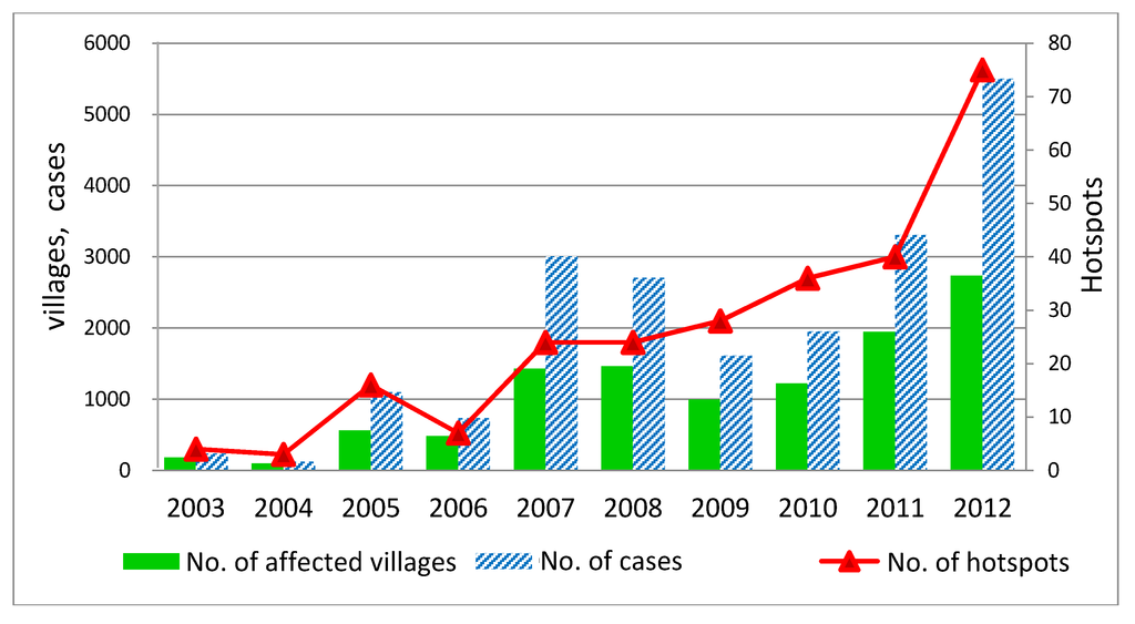 Number of affected villages, number of cases and number of hotspots in the upper north of Thailand during 2003–2012.