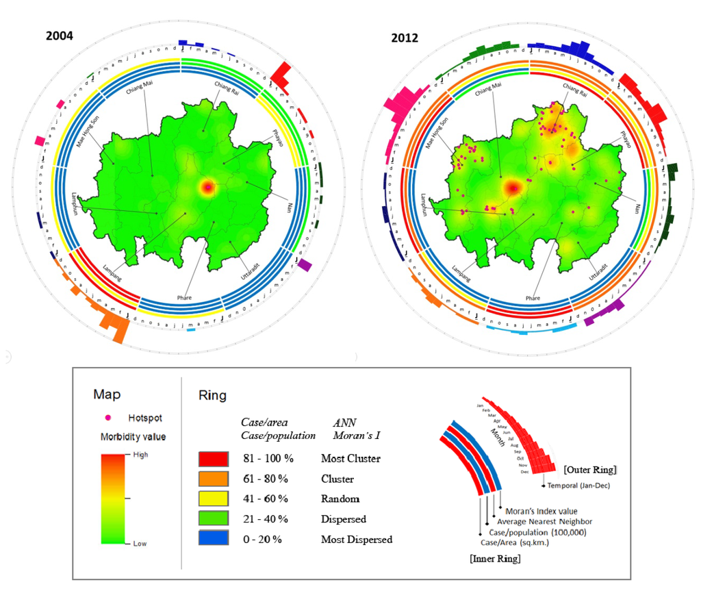 The Hybrid Ring Maps for both years represent clear differences in spatial and temporal results. Although the smallest outbreak was observed in 2004, interestingly, both hotspots and high morbidity can be observed in the same area, located in the northern part of Lampang province. The inner ring showed more clustering (81%–100%) in this province than in the surrounding provinces. The monthly variation in outbreaks (outer ring) was also higher than in the other provinces. However, as represented by the outer ring of 2004, several other provinces, including Phayao, Uttaradit and Lampang, also saw many outbreaks in January.