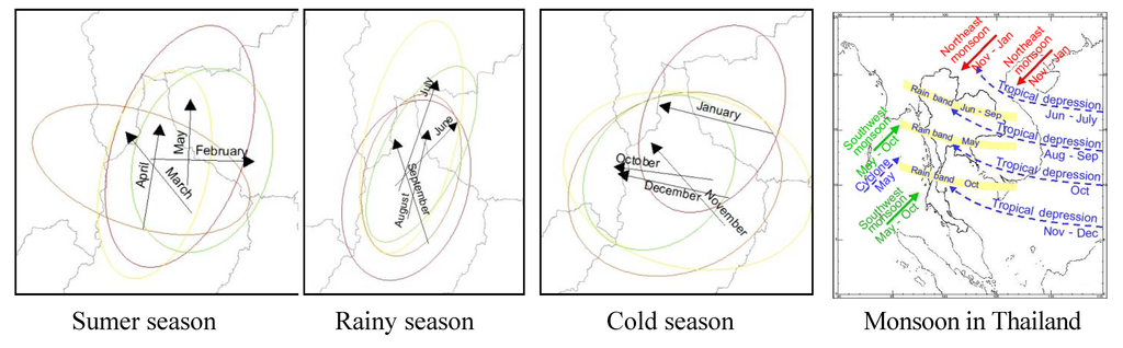 GIS and a global spatial analysis method with spatial autocorrelation were applied to study the occurrence of the disease at the village level over the study period from 2003 to 2012. The results showed that the distribution patterns were clustered throughout all years except 2007, during which the cases exhibited a dispersed pattern. The most intense clustering occurred in 2004, with a Moran’s I of 0.634. Viewed by season, the most prominent outbreaks were found during the rainy and cold seasons. The mean center site remained in the northern part of Lampang province over the whole period. The Standard Deviation Ellipses of the villages affected by the disease covered nearly the entire area in the middle north and the northeast with seven out of all nine provinces. The trend of the global diffusion pattern was from northeast to southwest. The Linear Directional Mean classified by season revealed the influence of the annual monsoon (Figure 12). Significant differences occurred between the individual rainy seasons, but all LDMs followed a similar path in the northern direction. This corresponds to the southwest monsoon during this time of the year, and it indicates that the movement of the MC during this period is influenced by the southwest monsoon. This is consistent with studies conducted in China reporting that from May to June, intense disease clusters began to move from the south to the north [46]. The LDMs in the summer months showed different, irregular patterns. The monthly LDMs of the cold season, even though not clearly associated with the northeast monsoon, showed significantly similar patterns.