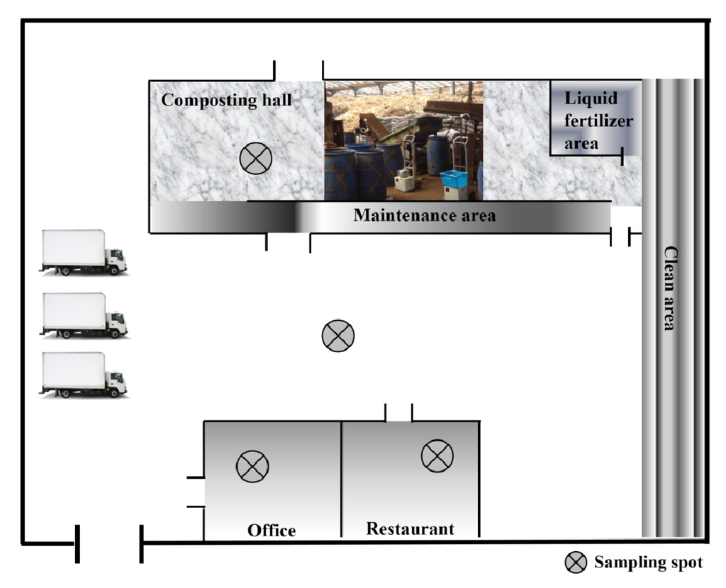 Layout of sampling pots of the food waste composting plant. The white color rea belongs an open access environment. The composting hall, maintenance, liquid fertilizer area, clean area, office and restaurant are closed building equipped with windows and ventilation system.
