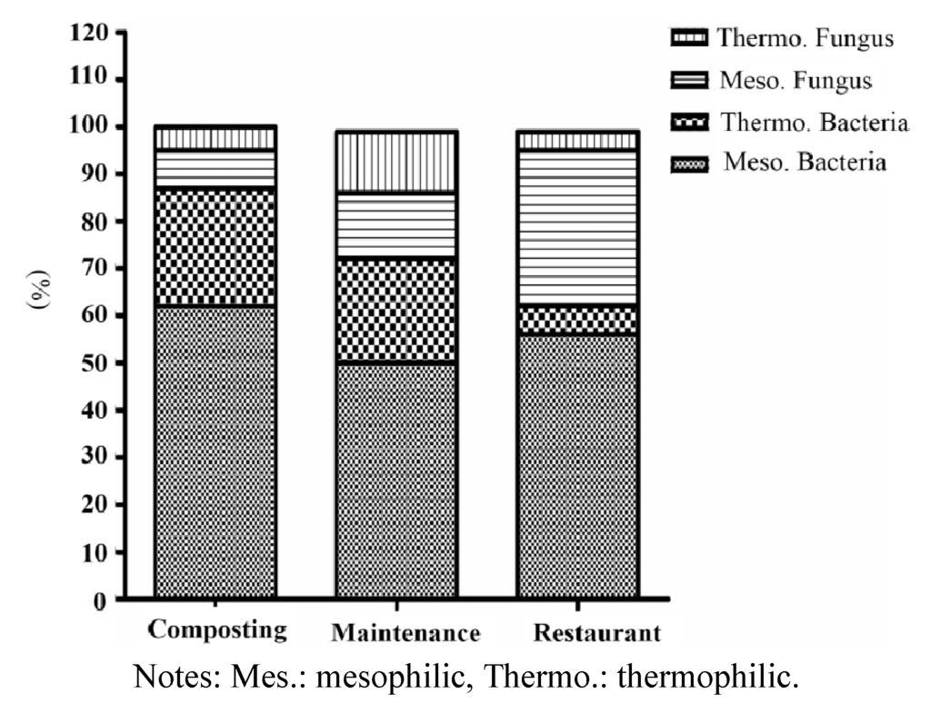 Distribution of microorganisms in the composting hall, maintenance and restaurant.