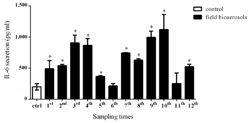 IL-6 secretion of NCI-H292 cells cultured with field bioaerosol samples. Confluent NCI-H292 cells (5 × 105) were individually cultured with the conditioned medium of field bioaerosol samples for 24 h. Asterisk indicated significant at p < 0.05 compared with the control group.