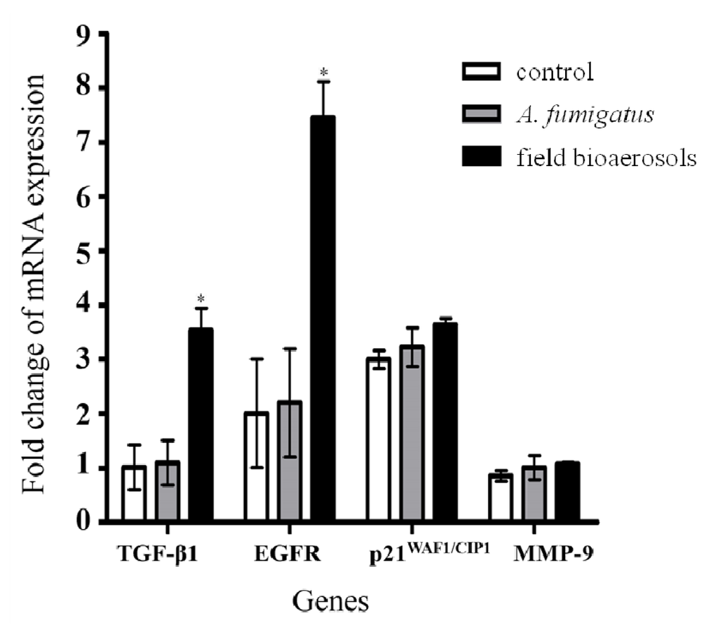 Quantitative expression of remodel genes in NCI-H292 cells treated with control group, standard A. fumigatus or field bioaerosol samples for 24 h. The bars were represented the mean fold change of mRNA expression between control group and treatment group at least three independent experiments. Asterisk indicated significant at p < 0.05 compared with the control group.