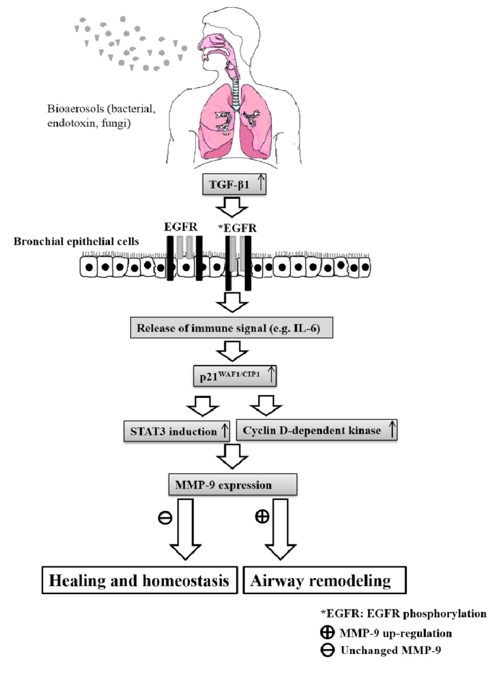 A possible mechanism of airway remodeling genes in response to bioaersol exposure in the composting hall. The atopic inflammation is triggered when innate immune cells of bronchial epithelial cells are exposed to bioaerosol allergens. The activation of IL-6 further recruits the inflammatory cells, and consequently programs epithelial cells to healing or remodeling. In addition, TGF-β1 activates EGFR phosphorylation and increases p21WAF1/CIP1 expression that implicates airway remodeling due to irregular cell proliferation and prolonged repair duration. The unchanged MMP-9 expression might be compensated for the over-expression of STAT-3 and cyclin D-dependent kinase. Consequently, both the atopy reaction and ligand induced activation of EGFR signaling cascade are to tend toward to guide cells healing or remodeling.