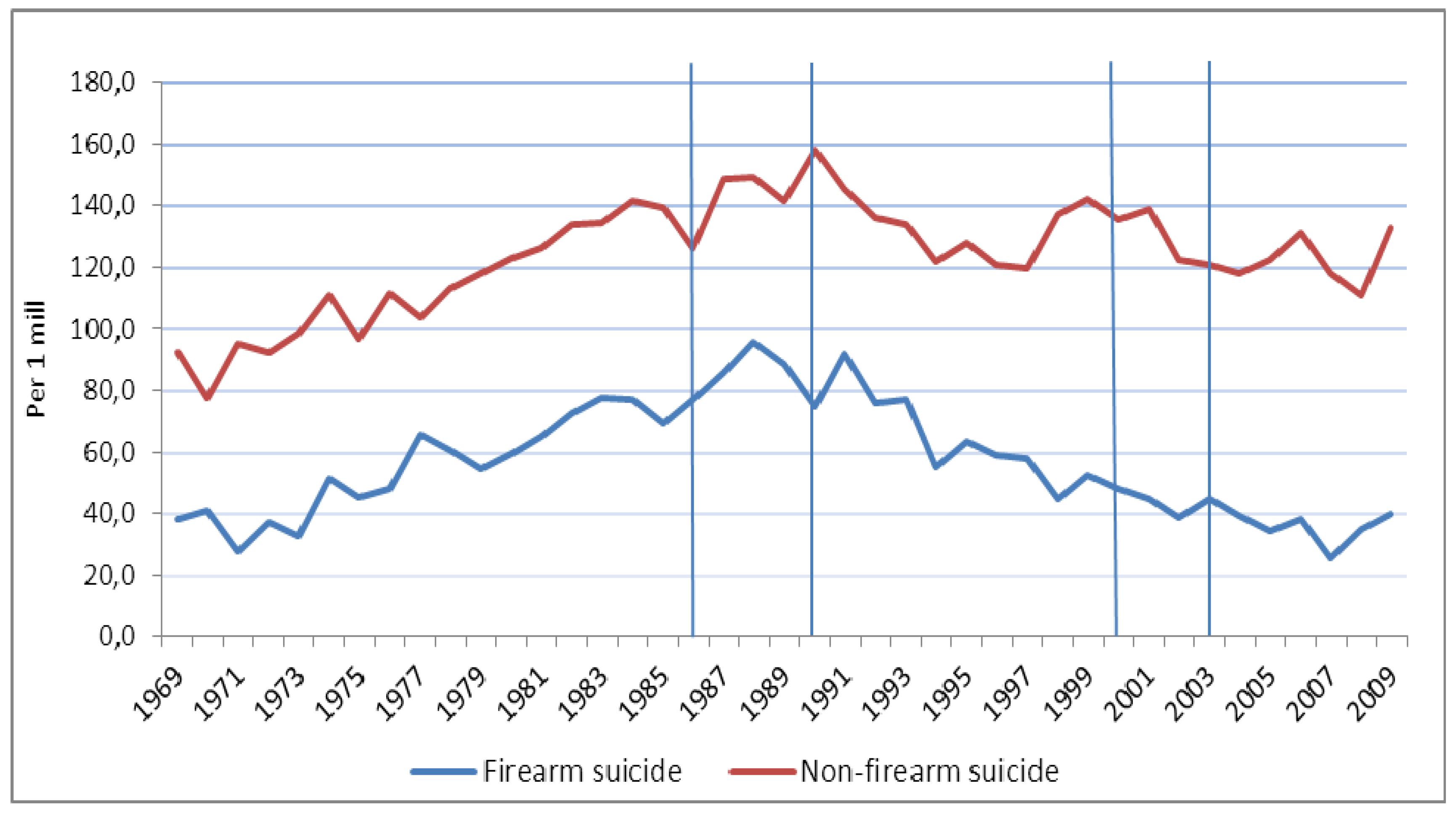 We observed different patterns of male unintentional and intentional firearm deaths during the four decades from 1969 to 2009, with a great reduction in risk levels from the end of the 1980s, especially of firearm suicide. In fact, male accidental firearm death rates declined during the entire period to a level between one and null per 1 million. We tested whether these encouraging observations might be due to stricter firearms legislation. Our findings did not provide much statistical support to this hypothesis. Given that data about firearm type were not available until 1996 and later—and that those data did not differentiate between rifles, shotguns, and army firearms—the most we can say is that there was evidence of a decrease in estimated trends in male firearm suicide (in the total sample, and in ages 15–34 years old) after 1990, and in male firearm homicide after 2003, which may be related to two laws (no change or increased rates in the reference group). However, other factors than stricter firearms legislation may be related to the changes in suicide rates in males and that these factors had an overall effect on the occurrence of suicide by all methods. Such factors might include prevention strategies, efforts to improve mental health services, and the chain of care for patients with intentional self-harm. In fact, a general reduction in suicide rates by approximately 25% was observed in Norway from 1988 to 1994, i.e., before the suicide prevention plans were implemented starting in 1994 [27]. From 1994 to 2009, during a period when the prevention plans were active, male non-firearm suicide rates did not change significantly (Table 4, Figure 1). Mental and behavioral disorders, as well as history of intentional self-harm (including suicide attempts), are strong risk factors for suicide [33]; thus, improved mental health care (both inpatient and outpatient hospital care), and follow-up care for patients who have been treated for intentional self-harm, may in all likelihood prevent suicide. After 1990, and especially during the years from 1998–2006, resources in mental health services increased in Norway. However, this change was not significantly related to either male or female suicide mortality [34]. Chain of care for patients who have received emergency medical treatment for intentional self-harm is another factor that may be related to change in suicide rates. However, no differences in changes of suicide rates were observed when Norwegian population areas with and without chain of care intervention were compared [35]. These findings may reflect the complexity and multiplicity in factors that contribute to the occurrence of suicide [36]. Our observational study was unable to separate any possible effect of firearms legislation from the effects of other factors; thus, we cannot rule out that the firearms laws had no effect on firearm suicide among young males.