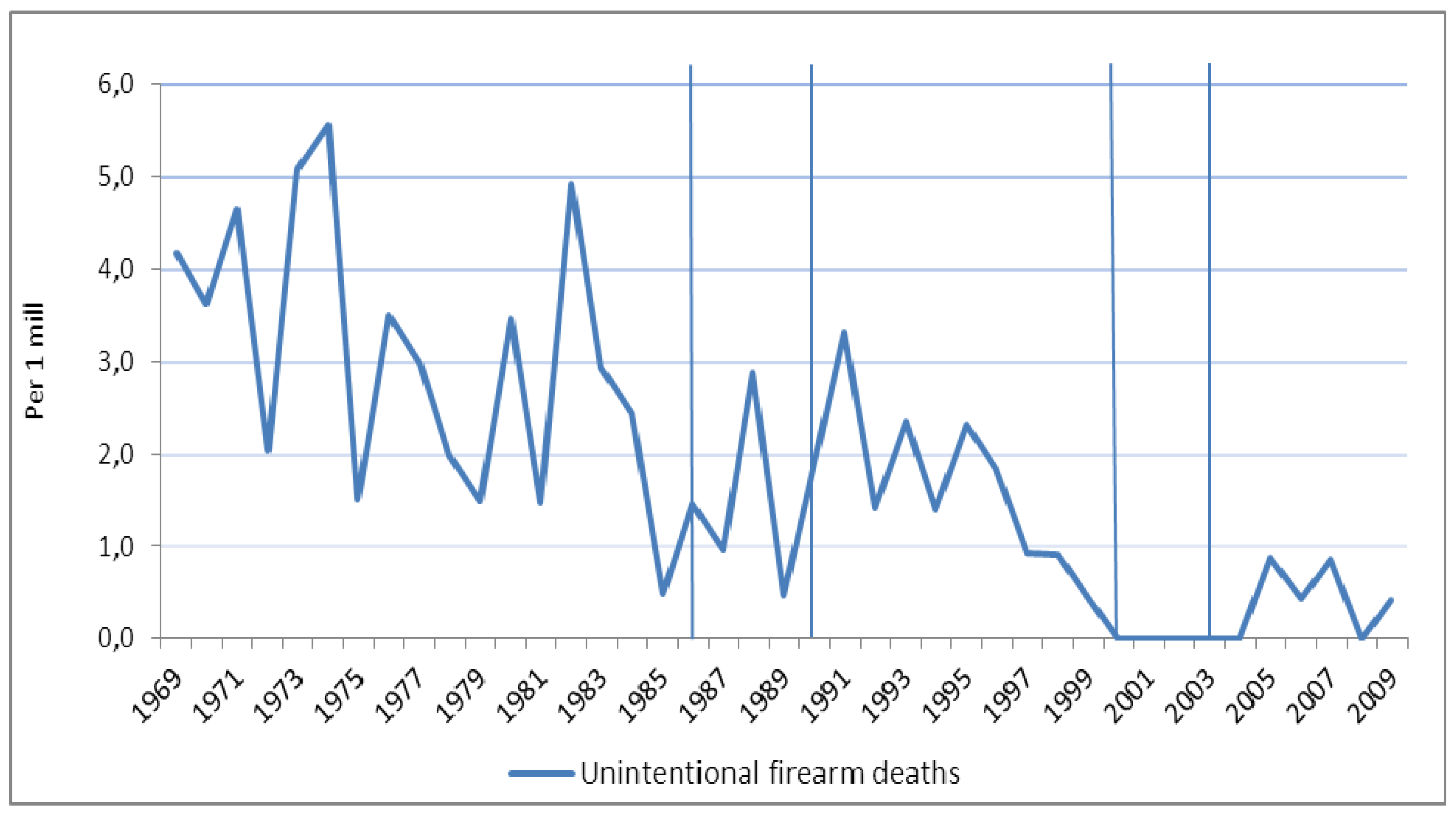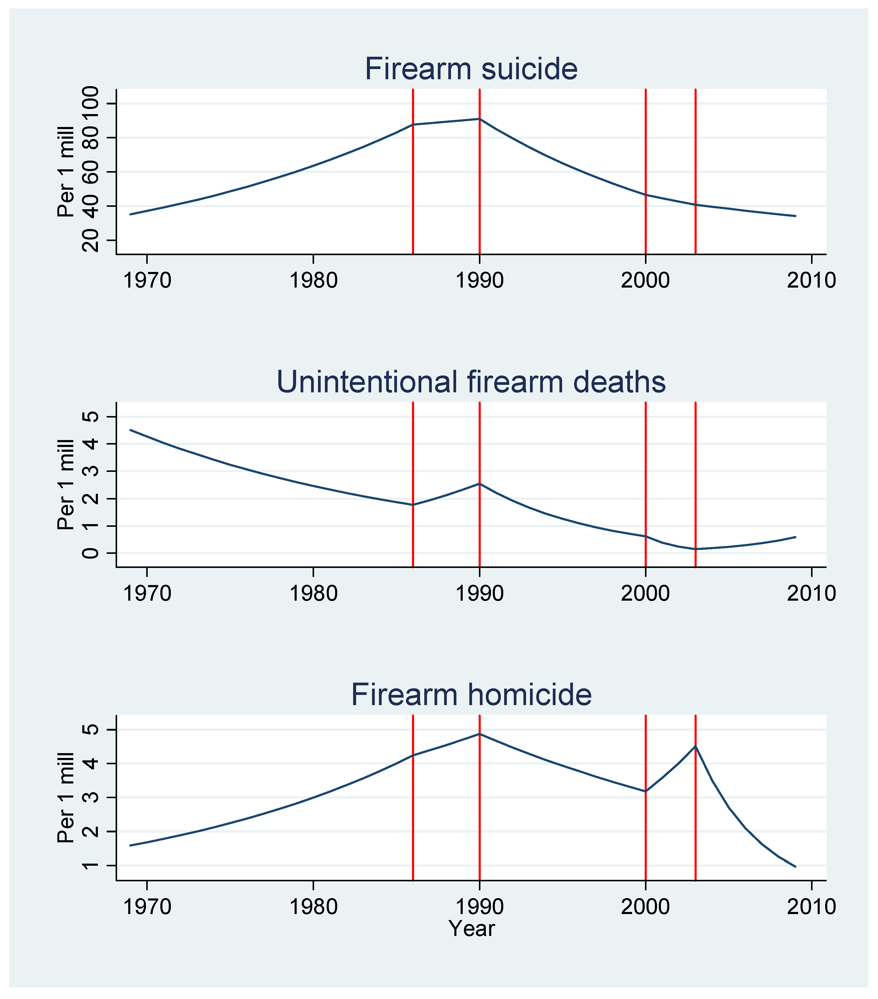 Any significant change in the trends of firearm deaths after the introduction of firearms legislation is difficult to interpret without making comparisons with trends in non-firearm injury deaths. We used reference data (controls) for suicide and homicide: non-firearm suicide and non-firearm homicide, respectively. For unintentional incidents (accidents), it is more complicated to theorize how a change in unintentional firearm deaths should be associated with changes in other unintentional injury mechanisms (e.g., drowning, poisoning, motor vehicle traffic, and falls). Therefore, changes in accidents due to mechanisms other than firearms should probably not affect any association between firearm accidents and firearms legislation.