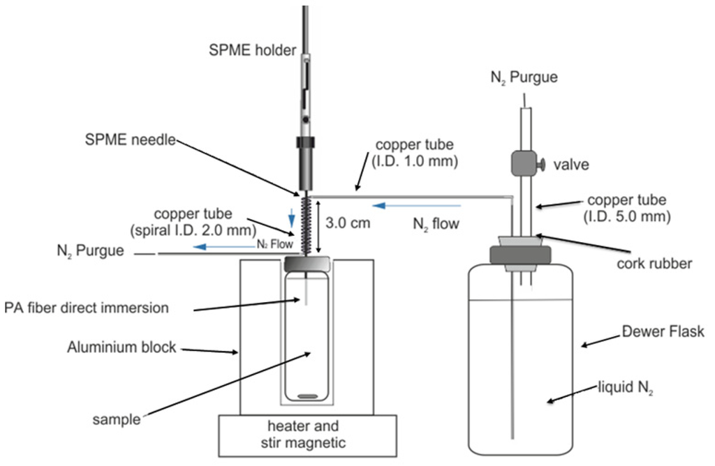 The analytes were extracted by direct immersion extraction using an 85 μm polyacrylate fiber []. The extraction was conducted using a cold fiber solid phase microextraction (CF-SPME) []. The cryogenic system used in this study was cooling on the outside of the fiber, as shown in Figure 1. A copper tube with a length of 70 cm, O.D. of 2.4 mm, and I.D. of 1.6 mm was used to transfer liquid nitrogen from a Dewar flask to the SPME device. One end of the tube was inserted into the Dewar flask through a rubber stopper, and the other end, composed of a 3 cm- spiral with a 2 mm I.D., held the needle of a manual SPME holder containing an 85 μm polyacrylate (PA) fiber. The rubber stopper (4 mm top diameter and 3 mm bottom diameter) was used to cap the Dewar flask containing 0.5 L of liquid nitrogen. Another copper tube (10 cm length, 6.4 mm O.D. and 4.7 mm I.D.) was used as a valve to control the nitrogen pressure in the Dewar flask; 0.5 L of liquid nitrogen was sufficient for 3 h of cooling. By closing the valve, the liquid nitrogen evaporated slowly and passed through the spiral at a constant rate, absorbing heat from the manual SPME holder and, hence, the fiber. When the valve was open, the nitrogen was purged from the Dewar flask and no longer passed through the spiral, thus terminating the cooling process. For the extraction, the cooled fiber was immersed in 22 mL Pyrex vials sealed with silicone/PTFE septa and aluminum caps containing the sample. The vial was placed in an aluminum block with a controlled temperature and constant stirring.