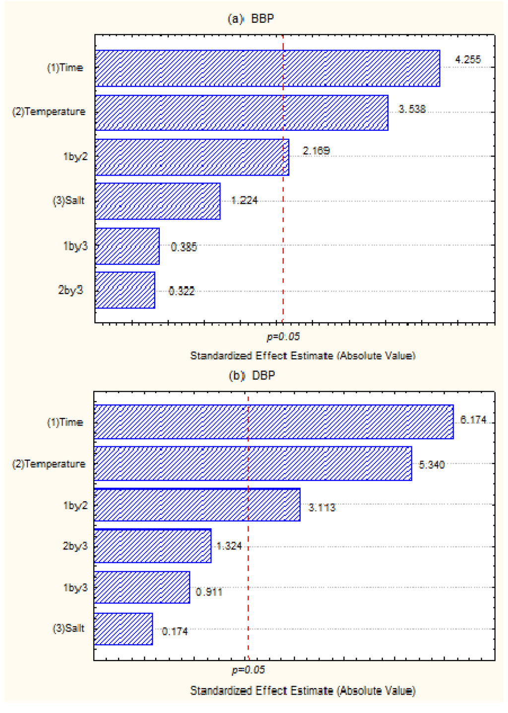 Pareto charts for (a) BBP and (b) DBP obtained from the 23 factorial experiment design.