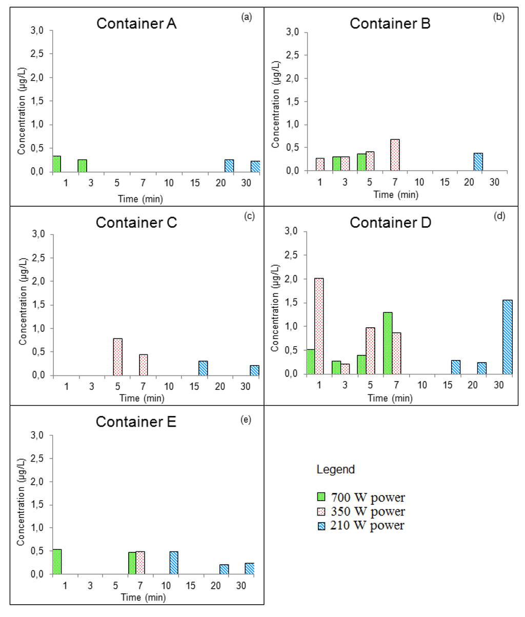 An examination of Figure 3 and Figure 4 shows that, in new containers the increase in heating time influences the increase in temperature; however, there is not a correlation between these factors and the migration of phthalates. Therefore, the DBP concentrations in the Group I containers were independent of the heating duration or the power conditions that were used for the containers that were evaluated. The variation in the concentration of DBP in the simulant was random. The highest concentration of DBP (2.0 µg/kg) was observed in container D. However, this values is less than the specific migration limit (SML) for DBP, which is 0.3 mg/kg.