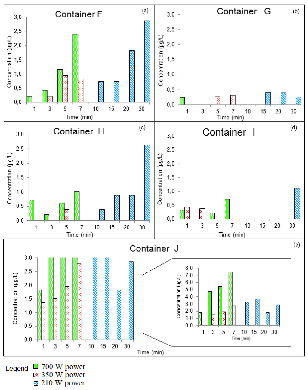 Container J had the smallest volume, 300 mL, and consequently a large temperature variation was observed in the interval from 1 to 3 min at the 700 W power level. Heating at this power for 3 min resulted in a final temperature of 90 °C. This temperature remained constant for the longest time; thus the simulant remained in contact with the container at a high temperature for a longer time which resulted in an increased migration of phthalates to the simulant. At the 350 W power level the temperature variation occurred more gradually and there was an increase in the migration of DBP with the increase in temperature. However, the variation in the concentration of DBP in the sample was lower. At 210 W power, a small variation of temperature was observed for different exposure times, and thus there was not a linear relationship between exposure time and phthalates migrations.