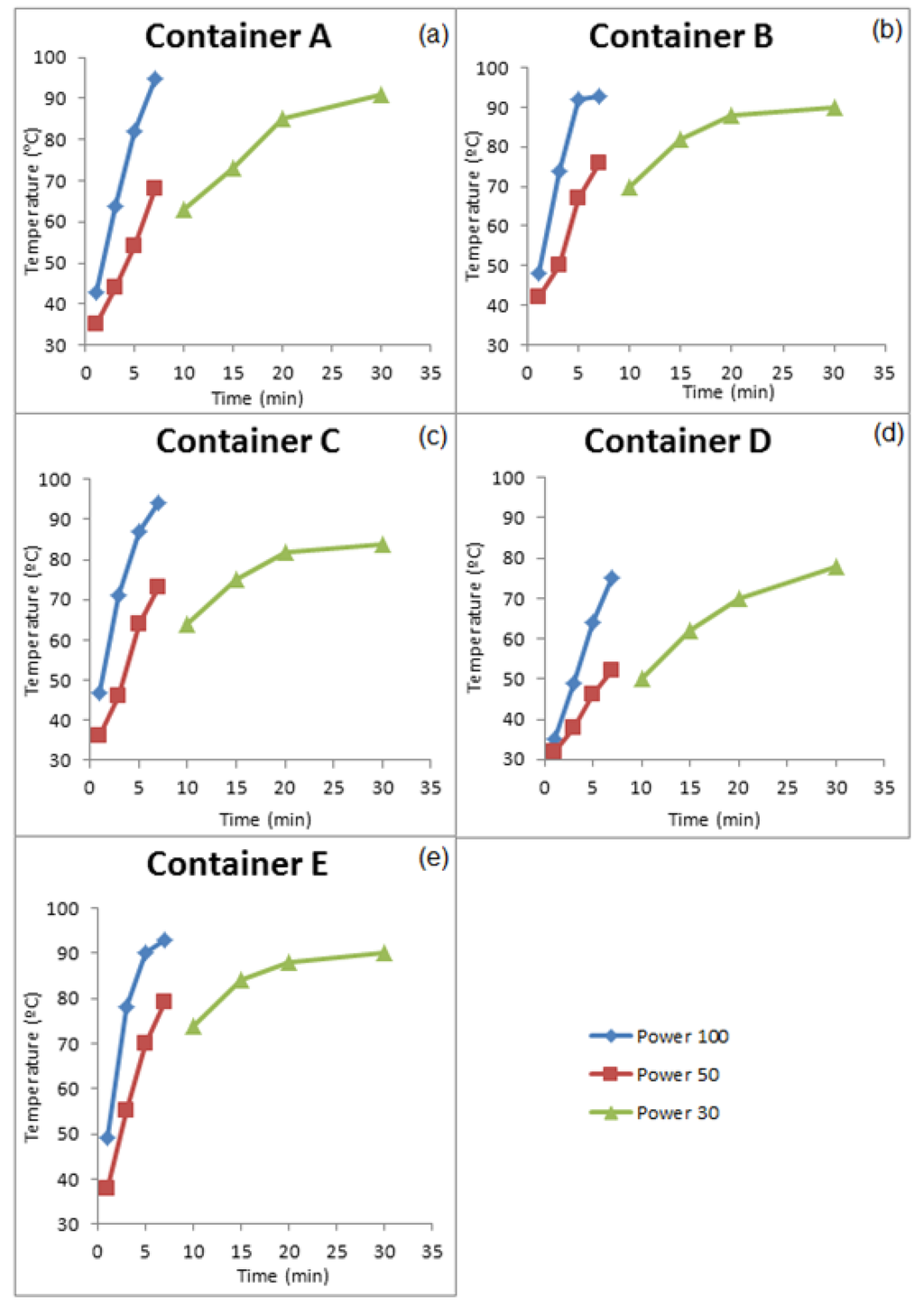 Temperatures of simulants measured for times and powers studied for Group I containers (a) Container A, (b) Container B, (c) Container C, (d) Container D, and (e) Container E.
