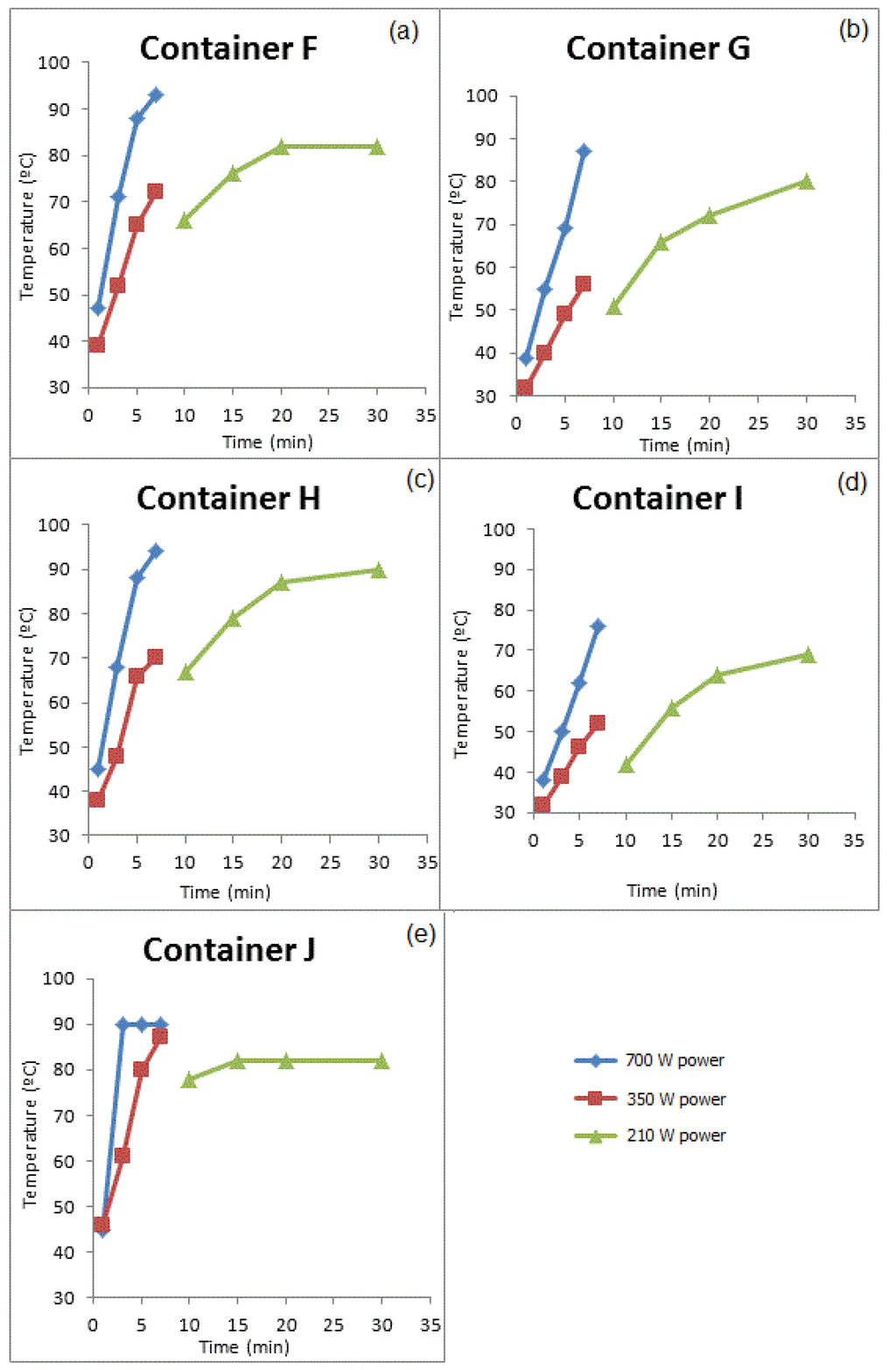 Temperatures of simulants measured for times and powers studied for Group II containers (a) container F, (b) Container G, (c) Container H, (d) Container I, and (e) Container J.