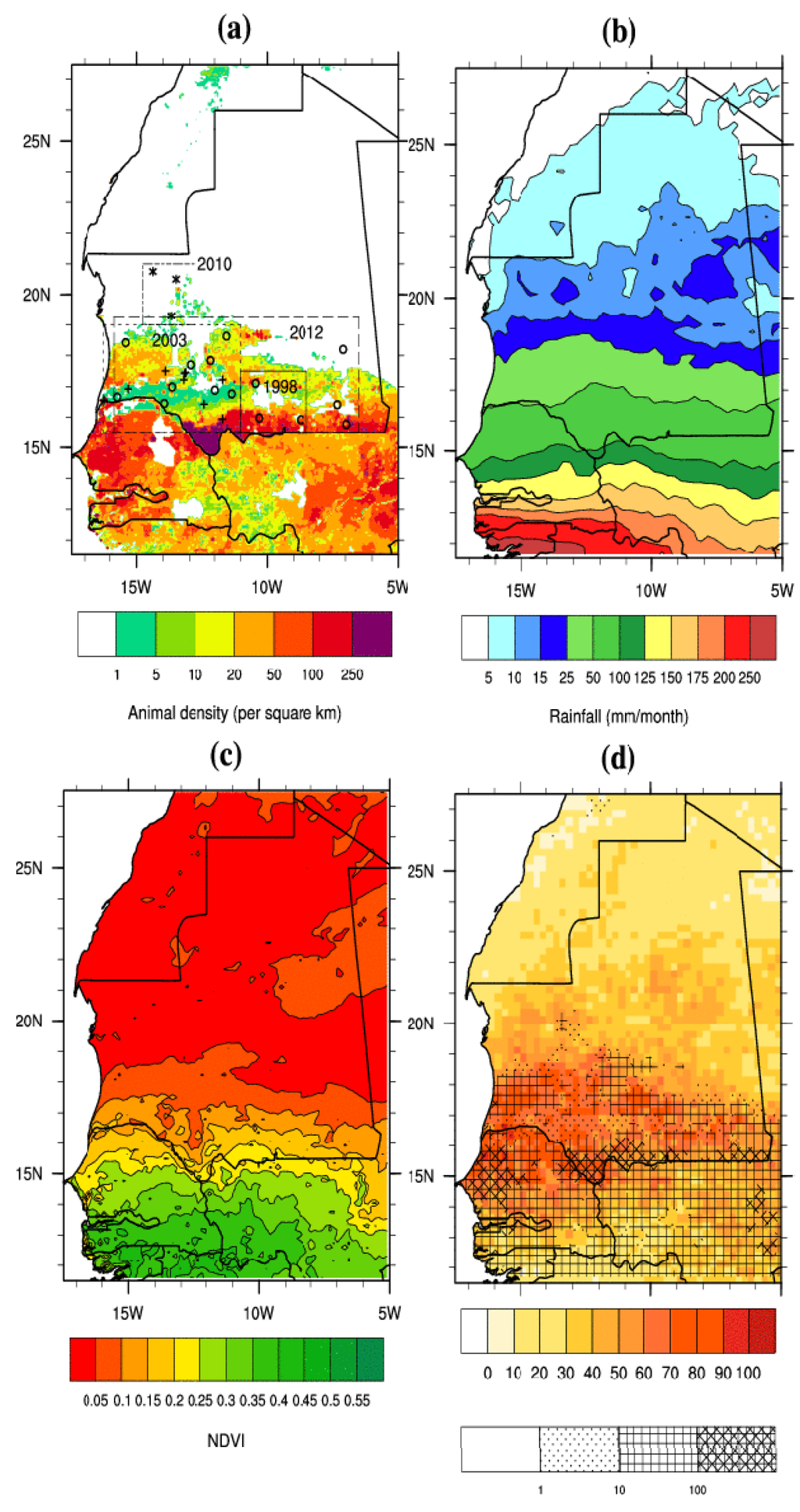 Figure 1d. This risk based on rainfall satellite estimates is high over northern Senegal and southern Mauritania where the animal density is large (stippled areas), and fits the spatial distribution of reported RVF cases in 1998, 2003 and 2012 (