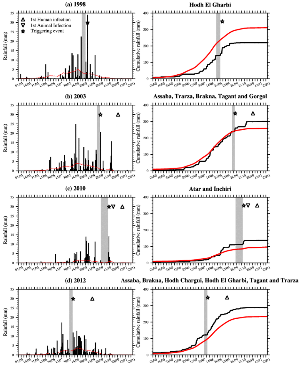 There are several caveats and limitations of this study that must be discussed. Firstly, the link existing between heavy precipitation following a dry spell and RVF risk might only be relevant for regions that experience a short rainy season, like regions located in the semi-arid Sahelian fringe (where most of the rains are concentrated from June to September). For these regions the pond/vector dynamic is strictly related to rainfall variability. In humid central and eastern Africa the land surface conditions (like soil moisture, vegetation, and landscape) might play a more important role. The availability of the pathogen is also a crucial point. As the Adrar region is a non-endemic part of Mauritania, there is no regular surveillance of RVF. This absence of data hampers our ability to discriminate how the mosquitoes became infected. A reasonable hypothesis is that the virus might have been introduced in the Adrar region in 2010 from viraemic animals transported by trucks from endemic southern Mauritania [