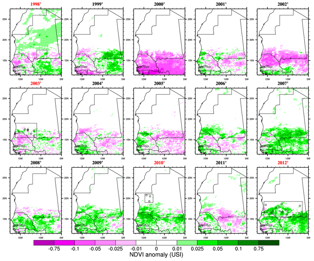Figure 2). In 2005 and 2010 the rainy season was wetter than average especially over northern Mauritania where a RVF outbreak was reported in 2010. In general, the seasonal rainfall amount or the averaged vegetation conditions do not seem to be strictly related to RVF outbreak locations in Mauritania. As an example, south-western Mauritania experienced large precipitation and positive NDVI anomalies in 2009 but no outbreak was further reported. This significantly differs from the climate-disease relationship highlighted for eastern Africa.