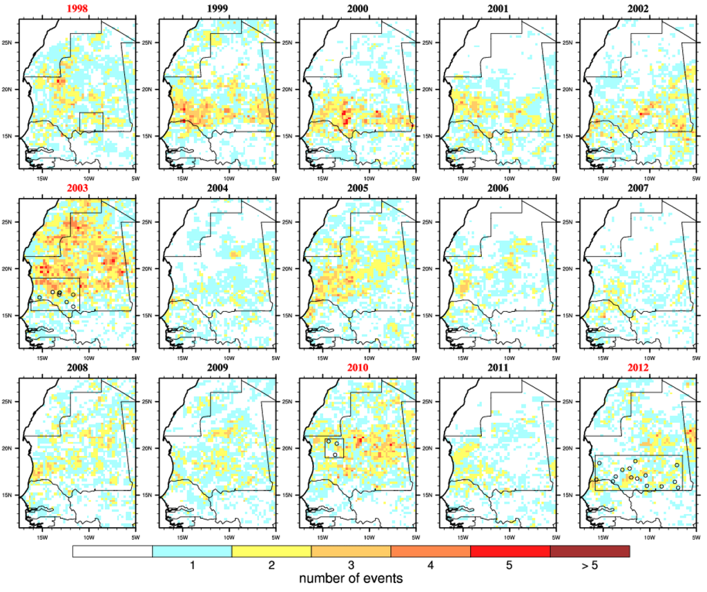 Number of embryogenesis risk events. This is defined by a dry spell (7 consecutive days with no rainfall) followed by a convective event (≥10 mm) occurring during the late rainy season (August–September–October). Outbreak years are highlighted in red and the locations of reported infections are shown by circles.