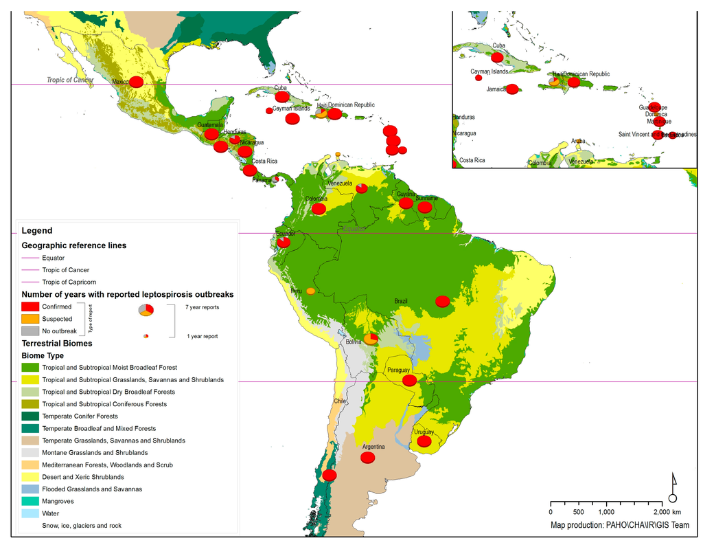 The data that can be extracted and analyzed from official records and scientific papers show the complexity of natural systems that leads to the occurrence of leptospirosis epidemics in the region. The first aspects to be considered are the biodiversity of the etiologic agent and the great diversity of mammals that can be carriers. Humans are an accidental host. Non-living components, such as water and soil, enable the transport of the bacteria between hosts. The persistence of outbreaks over time and the possible association with tropical terrestrial biomes, as seen on the maps, suggest that certain environmental and climatic conditions favor the possible mechanisms of transmission (Figure 1). However, more information is needed to better understand the multiple causal factors possibly linked to or associated with certain biomes within the geographic extent of the region. The biggest challenges regarding possible control measures are related to the existence of wild foci of infection where the etiological agent can be perpetuated through several different animal species within the mammalian clade.