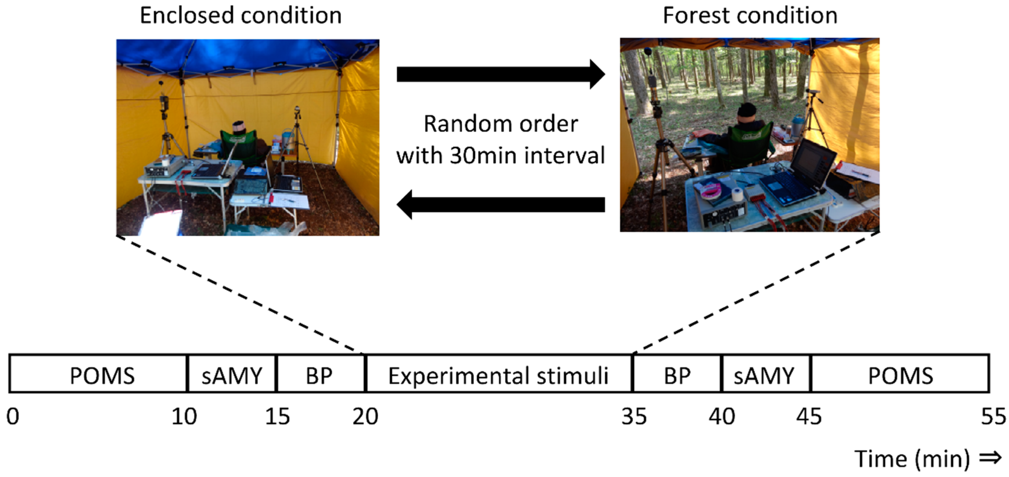 Experimental set-up of the Enclosed and Forest conditions. POMS, Profile of Mood States; sAMY, saliva amylase; BP, blood pressure.