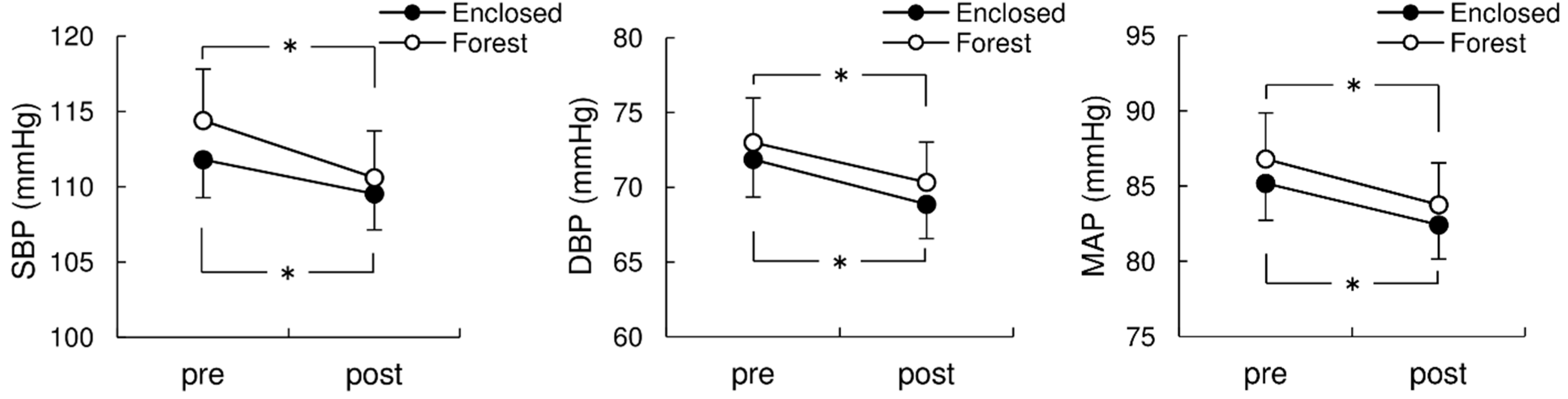 Changes in systolic blood pressure (SBP; left panel), diastolic BP (DBP; middle), and mean arterial pressure (MAP; right) between the Forest and Enclosed conditions. Values are mean ± SEM (n = 15). * p < 0.05 between pre- and post-values within each condition with the Bonferroni post-hoc test.