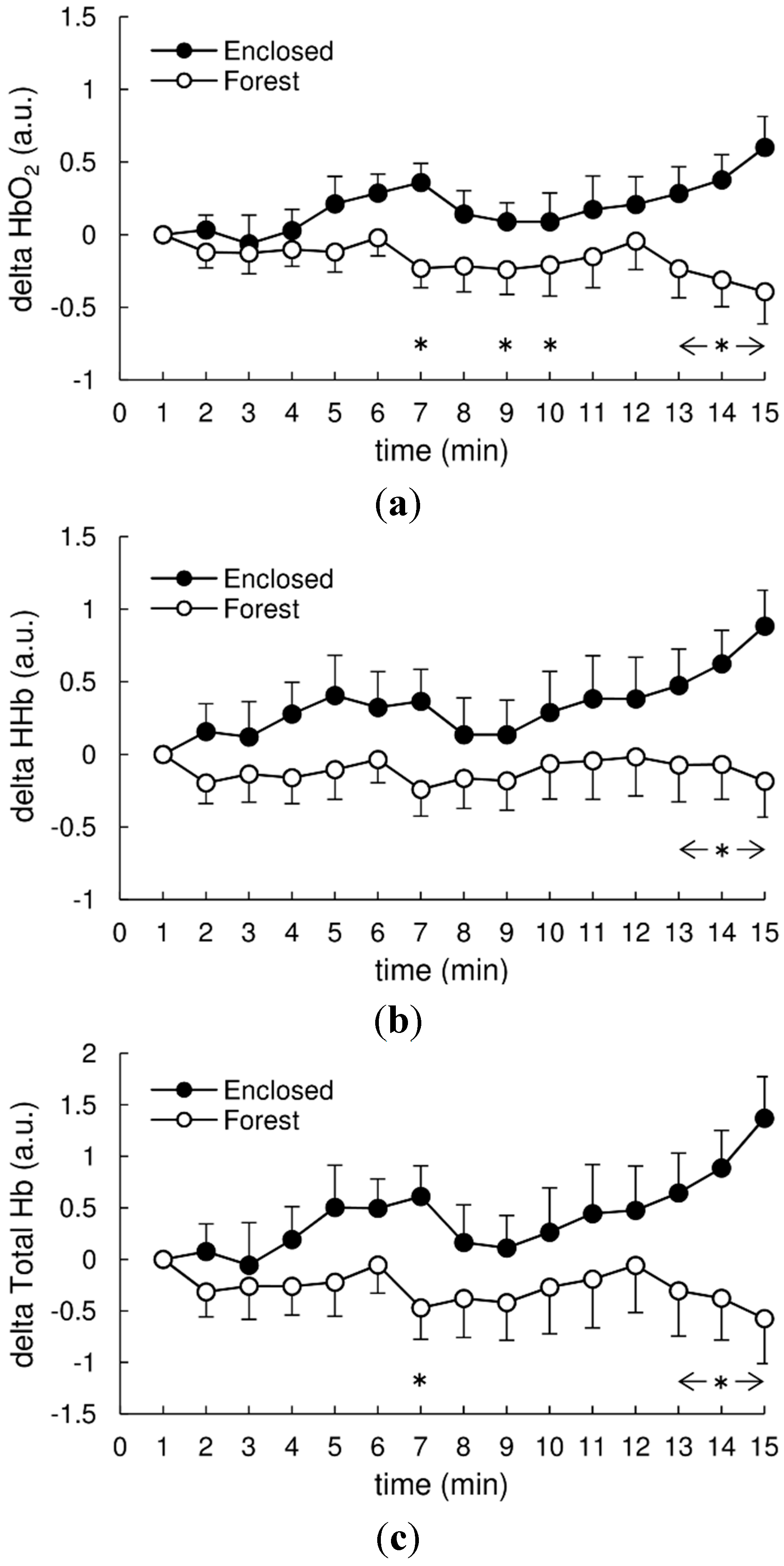 Delta changes in oxygenated hemoglobin (a) HbO2, deoxygenated hemoglobin (b) HHb, and total hemoglobin (c) Hb between the Enclosed and Forest conditions. Values are mean ± SEM (n = 15). * p < 0.05 between the Enclosed and Forest conditions with the Bonferroni post-hoc test.