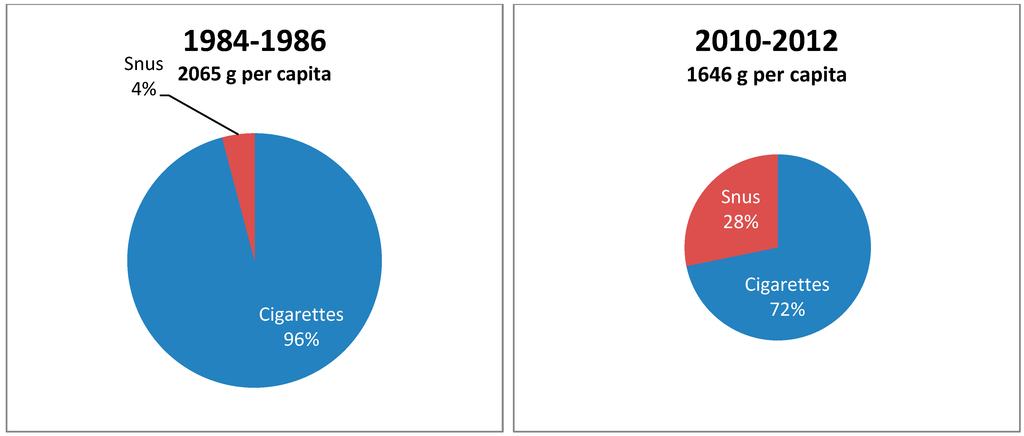 A third mechanism through which snus may have contributed to a decrease in cigarette consumption is that snus is used by many smokers to reduce smoking intensity or as a nicotine replacement where smoking is prohibited [21,23,24]. In Norway, dual users of snus and cigarettes have a weekly consumption of cigarettes that is 40% below that of exclusive smokers [24]. However, the proportion of dual users of snus and cigarettes has been quite small, and has not increased during the period when snus became more popular [24].