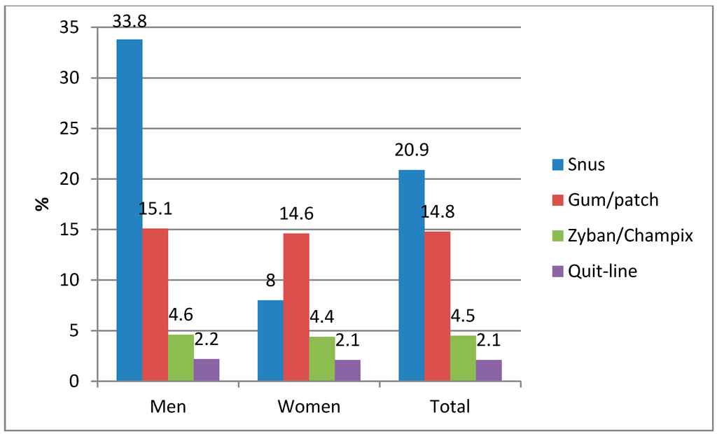 Among Norwegian ever-daily smokers who had used a specific method to quit smoking, snus was the most common (20.9%), followed by pharmacological nicotine products (14.8%) (Figure 2). The use of snus to quit smoking was particularly prevalent among male quitters (33.8%), while pharmacological nicotine was the most common method among females (14.6%).