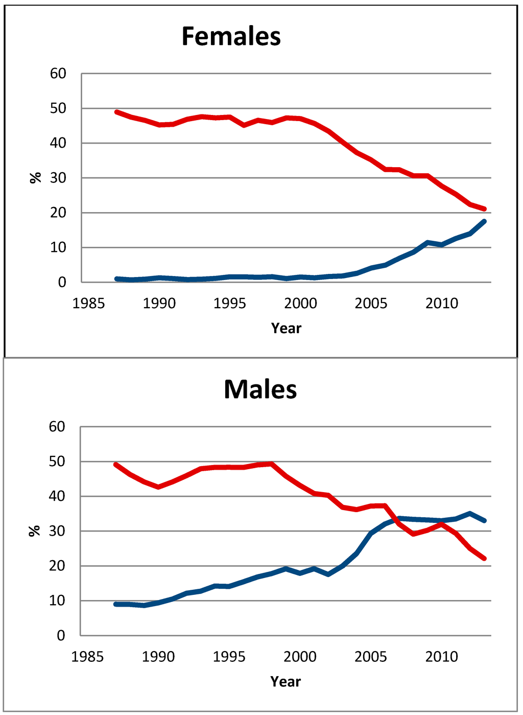 Use (daily and occasional) of snus (blue line) and cigarettes (red line) by Norwegian males and females in the age group 16–30 years for the period 1985–2013. Three-year moving averages.