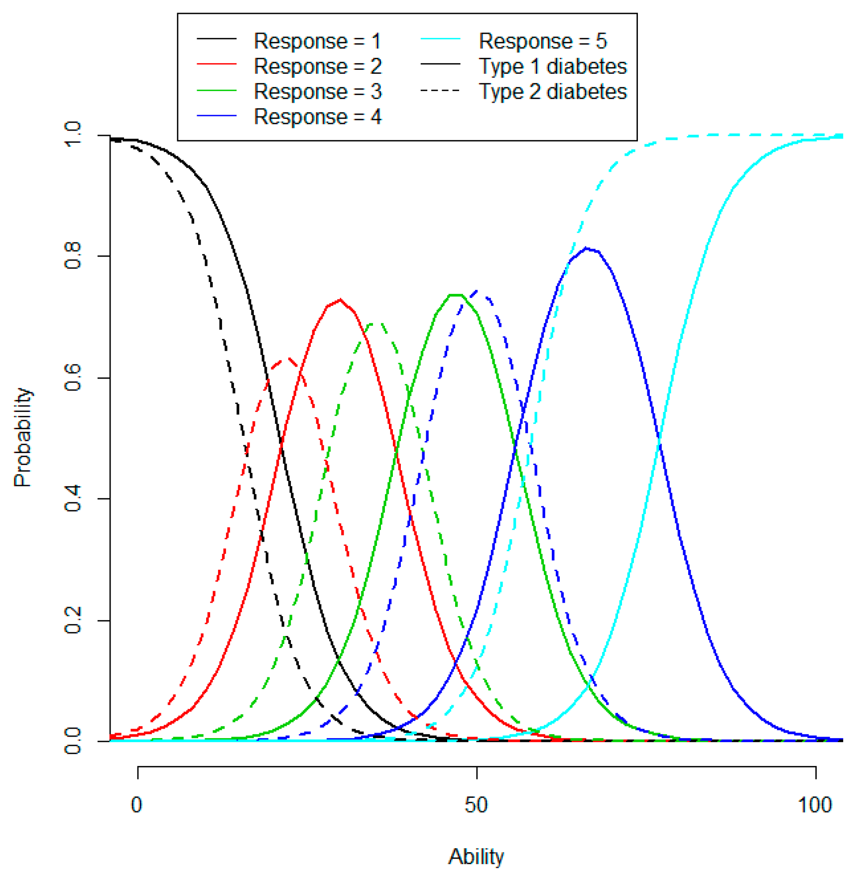 The item response category characteristic curves for item 24 (Sense of Security) are shown in Figure 1 for type 1 and 2 diabetes. Values of the latent variables are not directly comparable between diabetes types due to separate scale models, and the numerical difference in IRT score that stems from an item due to differential item functioning (the horizontal shift in Figure 1) may or may not correspond to a difference in the actual ability.