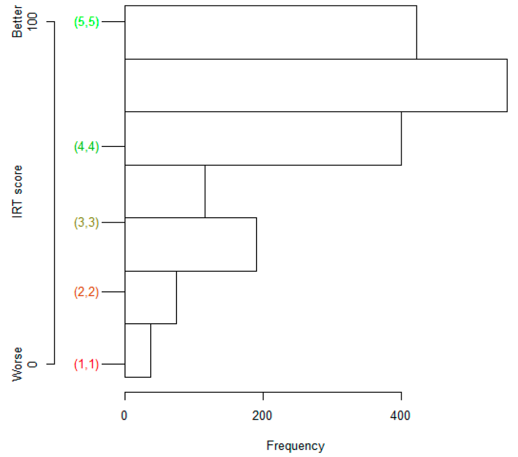 In our analysis of ad hoc response levels, we tested if low levels of abilities or judgments were associated with deviations in risk factors, or if high risk factor levels were associated with deviations in abilities and judgments, compared to the overall sample, in order to see whether some of the collected data might be redundant. Subgroups of patients were defined as the patients with a value less than the tenth percentile of each of the abilities and judgments. Further subgroups were defined as the patients with a value above the ninetieth percentile of each risk factor. If the empirical distribution functions of an IRT score in one such subgroup differed from the overall sample (by diabetes type) with a p-value < 0.05, we flagged it as an association. We used this significance level only as a flagging device to identify potential associations that might be worthy of future investigation.