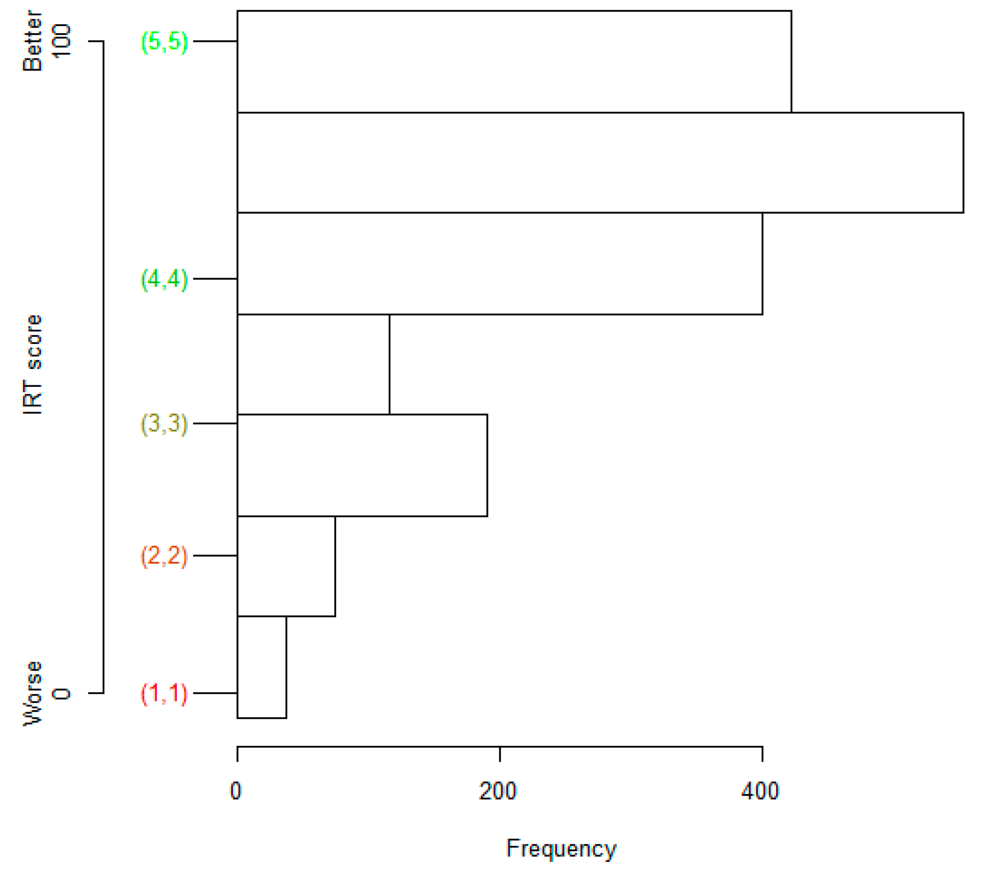 Items 1–30 and 36 were recoded so that the value 1 represented the least desirable response level for the patient, and higher values represented more desirable response levels. The ltm package was used to obtain IRT scores from complete or partially complete response data. Latent variables for each respondent were estimated, and we subsequently transformed them to a scale from 0 (least desirable) to 100 (most desirable).