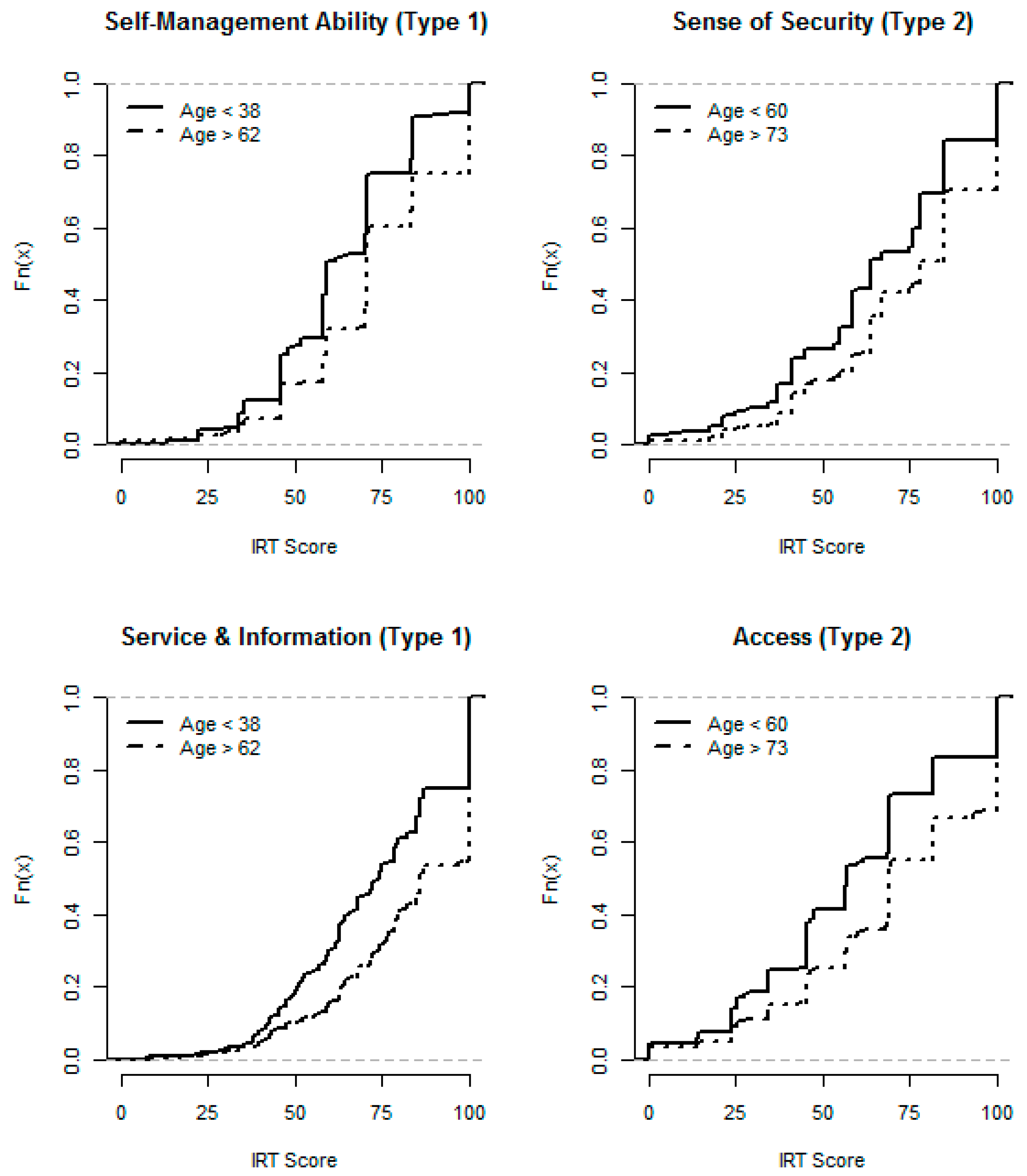 Empirical distribution functions: Self-Management Ability and Service & Information in type 1 diabetes, and Sense of Security and Access in type 2 diabetes, by age groups.