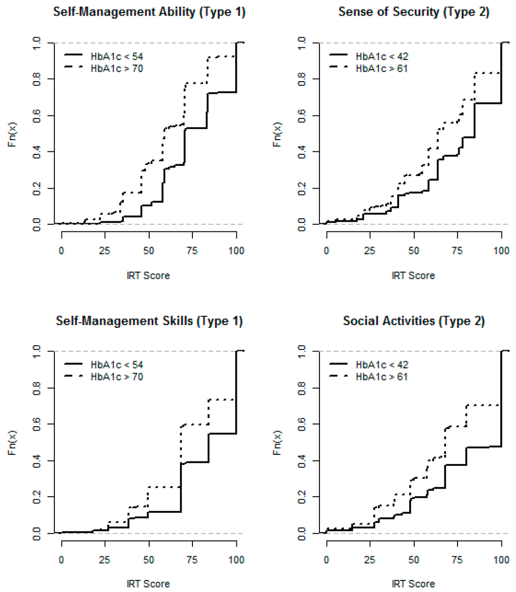 Empirical distribution functions: Self-Management Ability and Skills in type 1 diabetes, and Sense of Security and Social Activities in type 2 diabetes, by HbA1c groups.