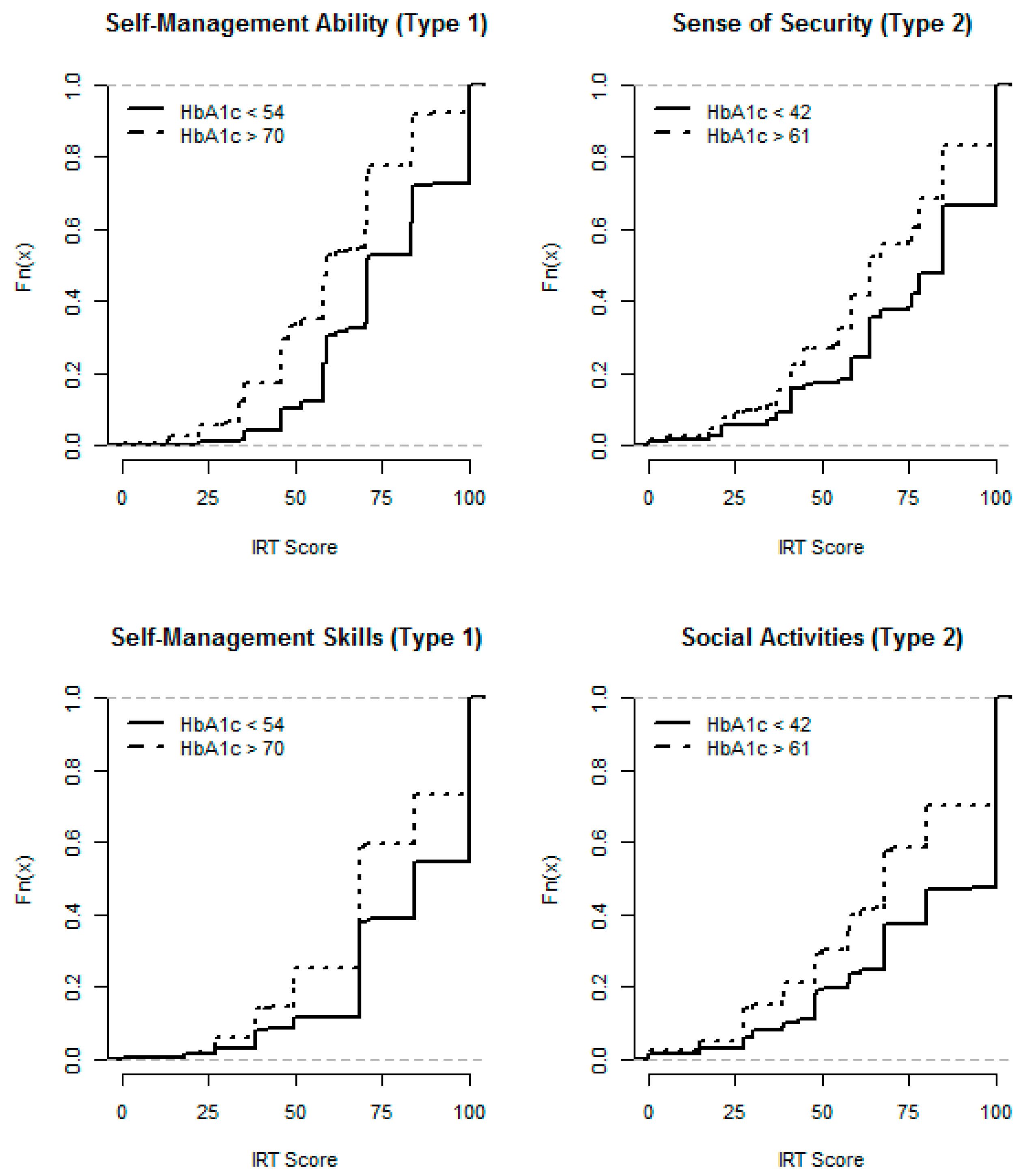 Notes: The distance between the curves shows how the scores differ between the HbA1c groups. Empirical distribution function Fn(x) = probability of (IRT Score ≤ x ), so a curve more to the left indicates lower IRT scores. HbA1c groups defined as below the first quartile, and above the third quartile, respectively.