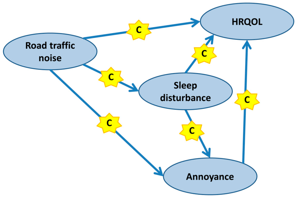 According to the Burden of Disease Report of the WHO [6], people annoyed by noise may experience a range of negative responses such as depression, anxiety or exhaustion, thus augmenting stress which is a recognised risk factor for cardiovascular diseases. For this reason, a better understanding of annoyance and its influence on health may help to prevent future health degradation. As stated in the theoretical framework of Stallen [10] and Soames [11], annoyance plays a role in mediating the further development of noise-induced health effects. Indeed, an internal mechanism of appraisal based on a set of non-acoustical factors such as attitude towards the noise source [10] or noise sensitivity [11] modify the annoyance reaction. Thus, subjects lacking the internal resource to overcome noise-induced stress and annoyance are more likely to present signs of health degradation in the long-term, although noise effects on sleep have also been observed in people who are not annoyed by noise [12]. In previous work [13,14,15] structural equation models have been used to disentangle the complex interplay between noise and noise-related variables such as annoyance, sleep disturbance, noise sensitivity and HRQOL.