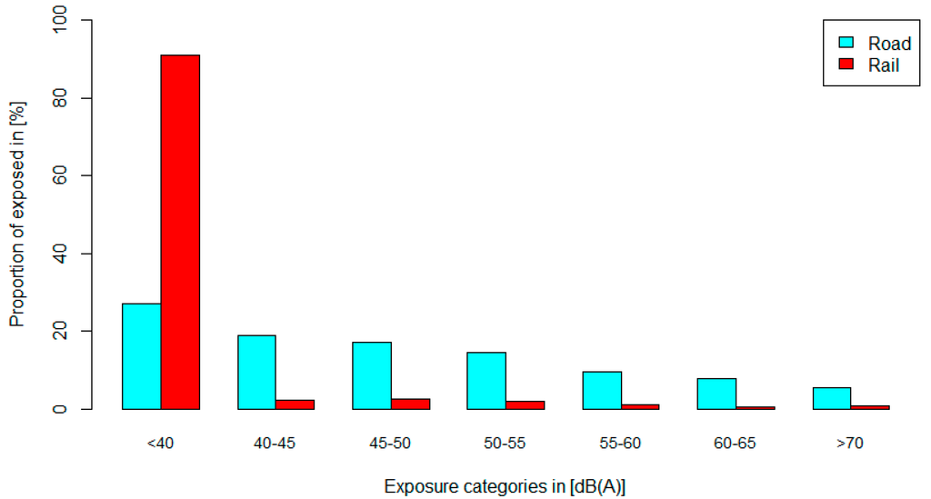 In terms of potential selection bias, road traffic and rail noise exposure was not significantly different between participants (mean Ldn road: 52.02 ± 6.18 dB(A) and mean Ldn railway: 23.59 ± 10.44 dB(A)) and non-participants (52.45 ± 6.28 dB(A) and 24.67 ± 11.10 dB(A)). Figure 2 shows the proportion of the study sample exposed to road and rail noise in 5 dB(A) Ldn categories. We decided not to conduct analysis on modelled noise exposure to rail noise due to the small number of highly exposed persons (94% and 95% exposed to Lday and Lnight noise levels <40 dB(A), respectively).