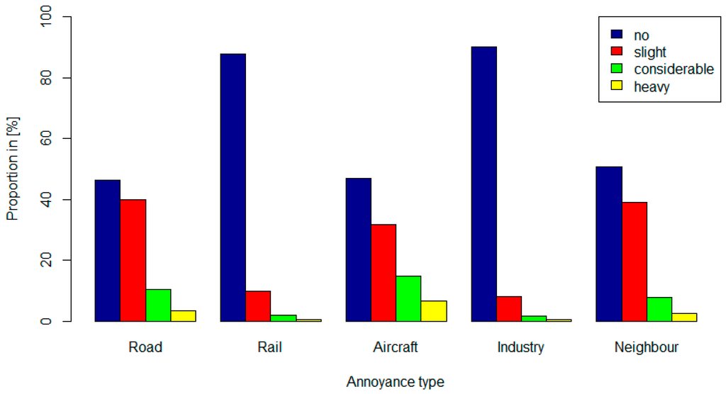 Noise annoyance at home due to road traffic, trains, aircrafts, industry and neighbours was evaluated using a four-points Likert scale with categories “no”, “slight”, “considerable”, and “heavy” [24].