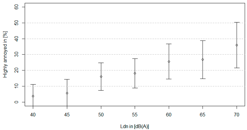 - Miedema, H.; Oudshoorn, C. Annoyance from transportation noise: Relationships with exposure metrics DNL and DENL and their confidence intervals. Environ. Health Perspect. 2001, 109, 409–416. [Google Scholar] [CrossRef] [PubMed]