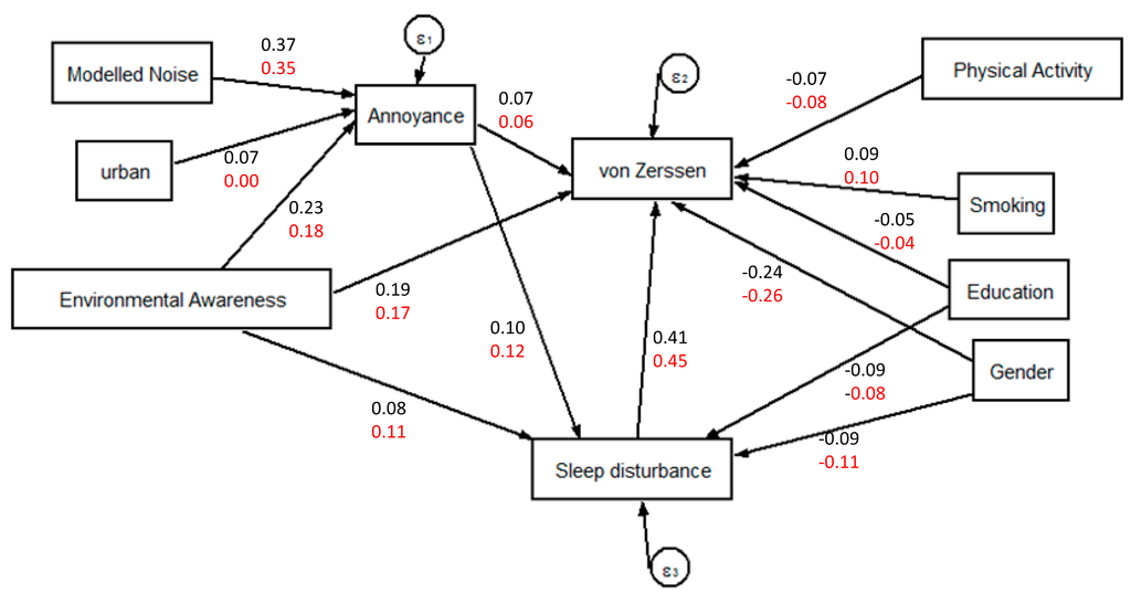 Model A, SEM describing the relation between road traffic noise, annoyance to road traffic noise, sleep disturbance, the von Zerssen score and their confounders. Z-normalised model parameters based on baseline (displayed in black) and follow up (in red) observations.