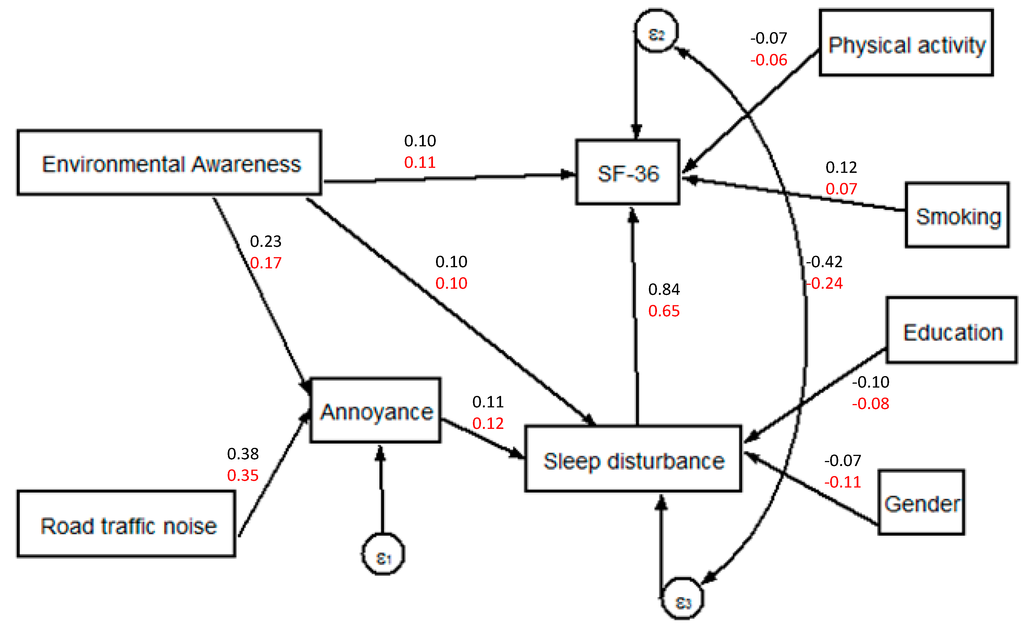 | Annoyance to road traffic → SF-36 | 0.09 [0.05, 0.14] | <0.001 | 0.08 [0.04, 0.12] | <0.001 |