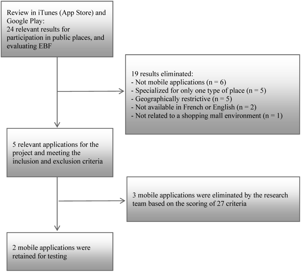 A mobile application is a program downloadable for free or for a minimal fee and executable from the operating system of a mobile device [19]. Between May and August 2013, we identified existing mobile applications designed for evaluating an environment’s EBF using Appstore (Itunes) and GooglePlay search engines. The search was performed using these key words: “access*”, “disabl*”, handicap, “shop*”. Inclusion criteria for the mobile applications were: (1) designed for adults, (2) included an EBF evaluation (e.g., using a rating scale or a EBF checklist), (3) relevant for activities performed at a shopping mall and (4) available in French or English. Exclusion criteria were: (1) the mobile application was geographically restrictive (e.g., evaluated only one city) and (2) the mobile application was specialized for one type of environmental feature only (e.g., bathroom, parking lot).