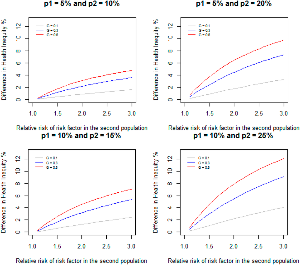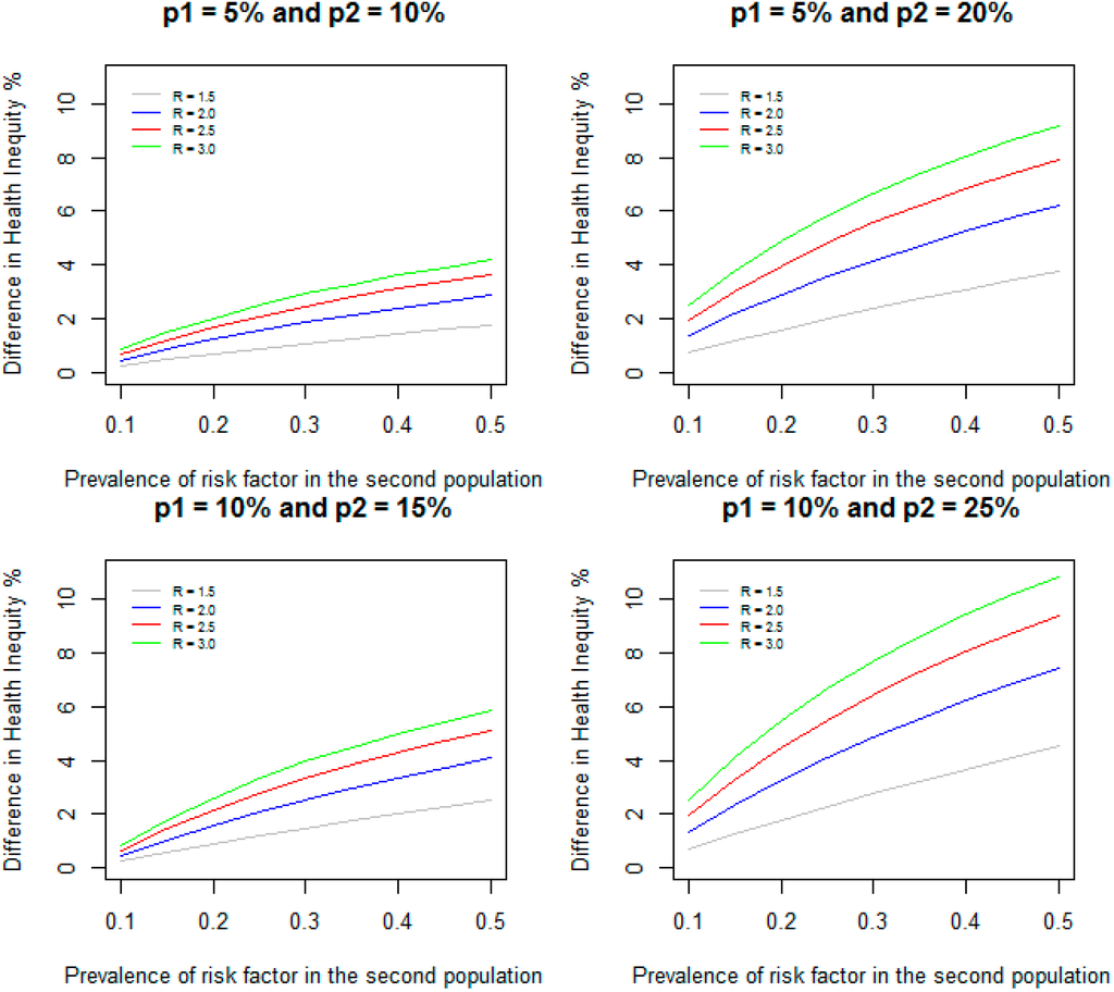 The Blinder and Oaxaca decomposition method can be used to study the contribution of risk factors to mean outcome difference between two groups [,]. This method involves fitting regression models to outcomes of the two populations and partitioning the regression models into explained and unexplained components. This method only allows one to calculate the contribution of each independent variable to the explained component. Our method can be used to study how the difference in prevalence of a risk factor and the relative risk associated with the risk factor in two different populations contribute to the difference in health inequity between the two populations due to that risk factor. A similar approach has been used to estimate the difference in disease incidence between two population groups due to biological risk factors [].
