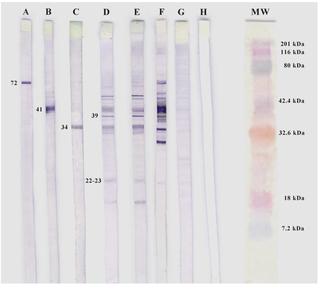 Western blotting of B. burgdorferi. A: MAb CB312 ; B: MAb H9724 ; C: MAb 84C; D and E: Sera positive patient for IgM (second and third samples respectively); F: Positive control; G: Negative control; H: white control (PBS); MW: molecular weight (BioRad).
