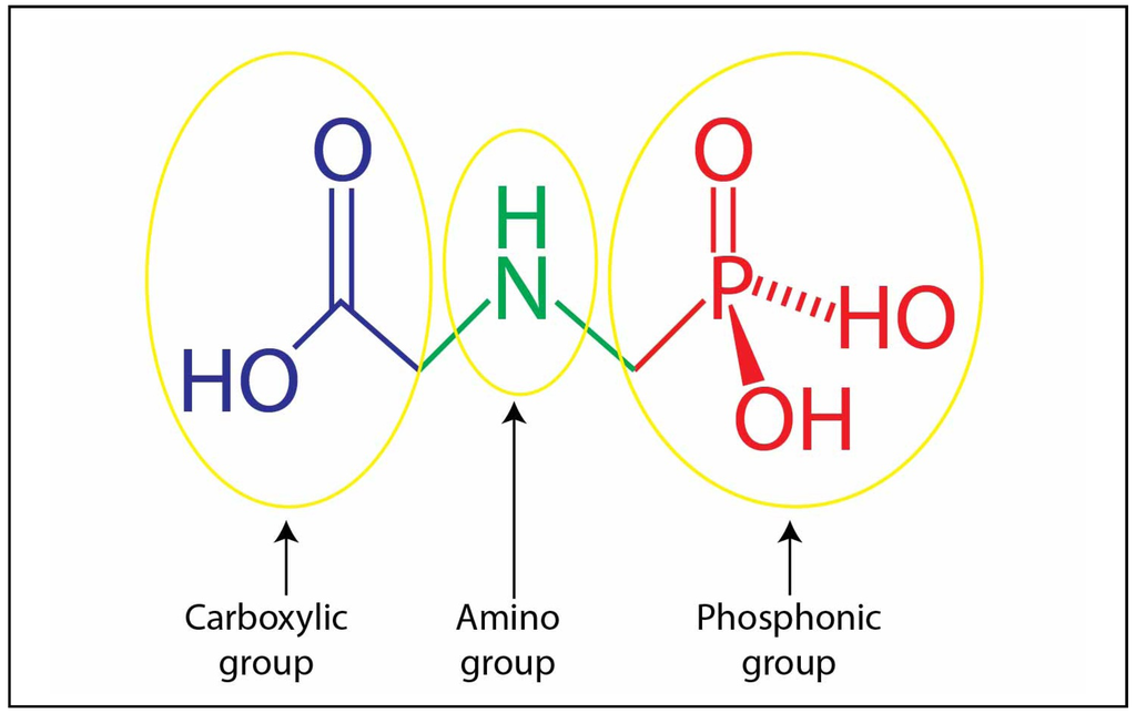 Glyphosate or N-(phosphonomethyl)glycine is the aminophosphonic acid analog of the natural amino acid glycine. It was supposed to be first synthesized by Henri Martin in 1950 [21]. The name glyphosate is derived from the word [Gly]cine [phos]phon[ate]. The Monsanto Company acquired another patent for the phytotoxicant properties of N-(phosphonomethyl) glycine [22]. Glyphosate was quickly adopted by almost all farming communities throughout the World and was hailed as the magical total weed killer. In fact, glyphosate was acclaimed as the pesticide of the turn of the millennium and as the most significant chemical in modern agriculture [21]. Glyphosate is a compound with an amphoteric and zwitterion structure containing a basic secondary amino function in the middle of the molecule, monobasic-carboxylic and dibasic phosphonic acidic sites at both ends, hence having three functional groups, phosphonate, amino and carboxylic [23] (Figure 2). A zwitterion is a neutral molecule with positive and negative electrical charges at different locations within the same molecule. It is different from simple amphoteric compounds that might only form either a cationic or anionic species depending on external conditions—a zwitterion simultaneously has both ionic states within the same molecule [24].