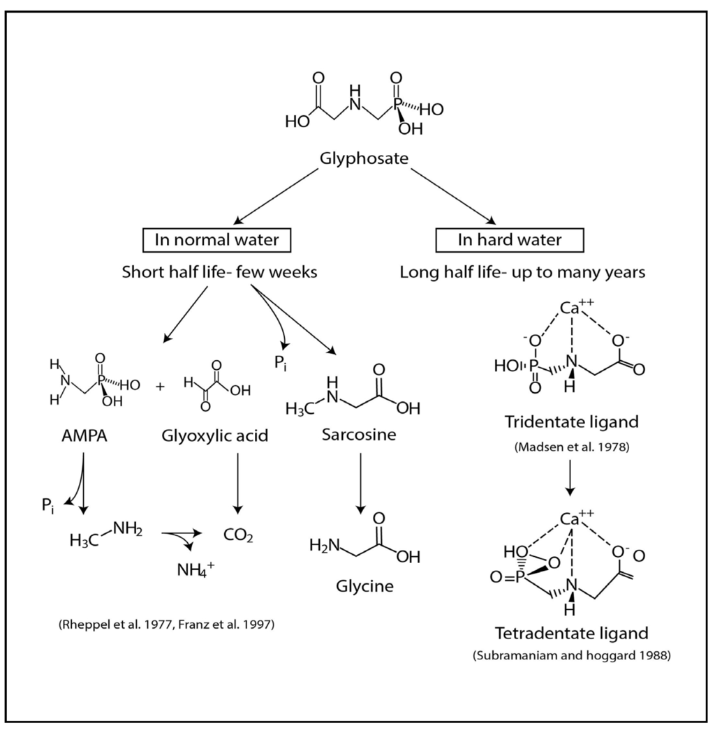 The next important question to be answered is whether the glyphosate-metal complex is nephrotoxic or not. Nephrotoxicity of As, Cd and other heavy metals is a known fact [62]. Many studies have been conducted to assess the activity of Ca-glyphosate, Mg-glyphosate behavior in soil water and in plants [38]. The majority of them have been targeted to overcome the antagonistic ability of Ca/Mg on glyphosate [63]. Although glyphosate has a history of more than 40 years of usage as an herbicide and it has been almost 50 years since the identification of hardness-aminophosphonic acid reaction, none of the available studies has focused on the animal or human health effects of hardness-glyphosate complex. However, glyphosate alone has been the subject of several animal studies.