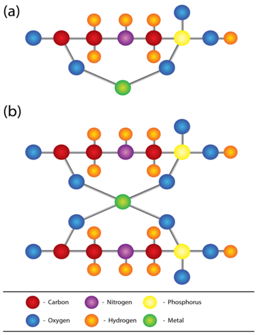 Structures of complexes formed by (a) one molecule (b) two molecules of glyphosate and metal.