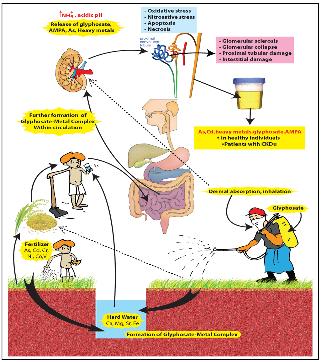The second link in the hypothesis is to confirm that the water from the wells which the CKDu patients have used is contaminated with glyphosate and metal ions. In another study that is ongoing at California State University, Long Beach, CA, USA we have tested water samples (n = 50) from these contaminated wells and found that almost all of them contained glyphosate with high content of Ca and other metals. The authors had to use a special Enzyme Linked Immuno-Sorbent Assay (ELISA) test to detect these glyphosate-metal complexes, as they are not amenable to the conventional analytical methods. Glyphosate and heavy metals were also found in the urine of both CKDu patients as well as the control subjects who lived in the CKDu endemic area. This is not surprising as most of the controls drank water from the same wells. Therefore, we have confirmatory proof on the ingestion of these complexes in drinking water and excretion of components of the complex in urine. The manner in which the glyphosate metal complexes are absorbed through the intestines needs further research, perhaps beginning with animal models. None of the CKDu patients (n = 125) showed any significant elevation of liver enzymes or ultrasound evidence of detectable liver pathology. This is the best evidence that we have so far about the escape from the first pass metabolism by the glyphosate metal complexes. This is the same reason why we see more renal manifestations in As poisoning of CKDu patients. However, we occasionally see the classic cutaneous and liver manifestations only in some CKDu patients with advanced renal damage [1]. Acquavella et al. [57] have demonstrated how the glyphosate excretion increased in 48 farmers and their families after spraying. However, they have not separately assessed the contributions of the dermal and respiratory routes of exposure. Further research should be undertaken to study how glyphosate is absorbed into the circulation through dermal and respiratory routes, particularly after spraying the pesticide.