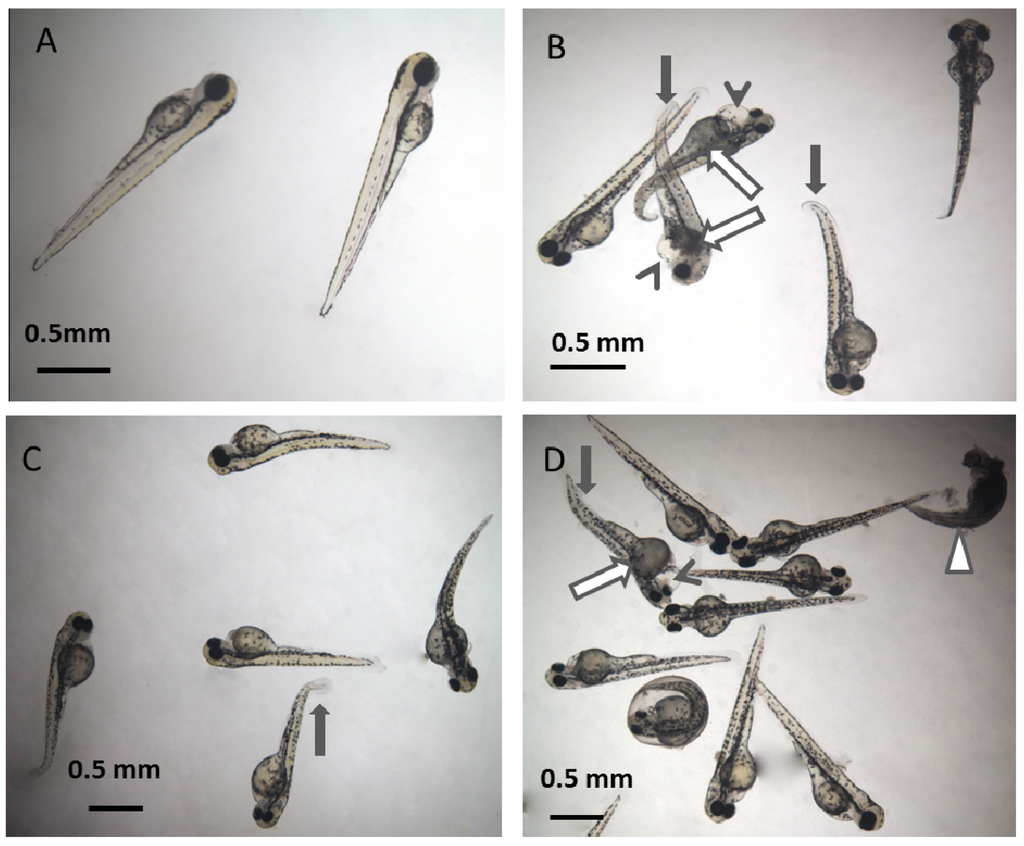 Representative photos of zebrafish (Danio rerio) embryos exposed to phthalates and phthalate mixture. (A): control; (B): 0.50 ppm BBP; (C): 1.50 ppm DBP; (D): mixture containing 0.50 ppm of BBP, DBP, DEHP, DIDP, DIDP and DNOP, respectively. Representative toxicity symptoms caused by phthalates includes death (empty triangle), tail curvature (solid arrow), necrosis (empty arrow), cardio edema (arrowhead) and no touch response.
