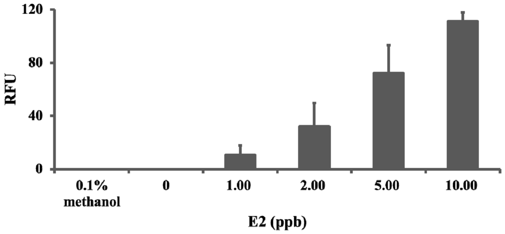 Dose-dependent induction of GFP in transgenic medaka (O. melastigma) eleutheroembryos by 17β-estradiol (E2). Transgenic eleutheroembryos were exposed to varying concentrations of E2 for 24 hrs and the induced GFP signal intensity (RFU) was measured (see Material and Methods for detail). No GFP was induced in solvent (0.1% methanol) and blank (0) controls.